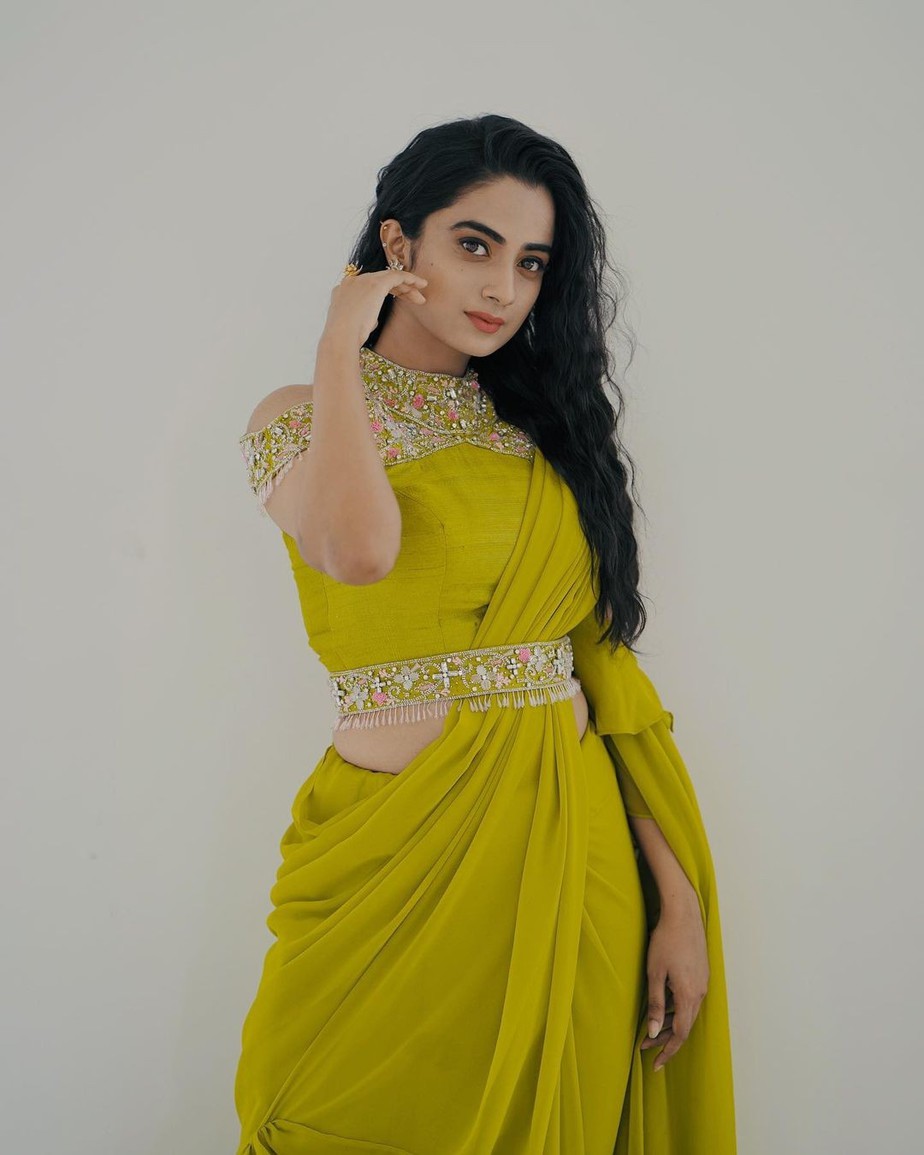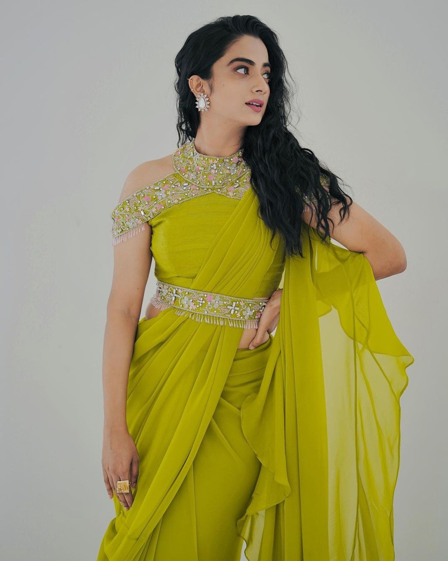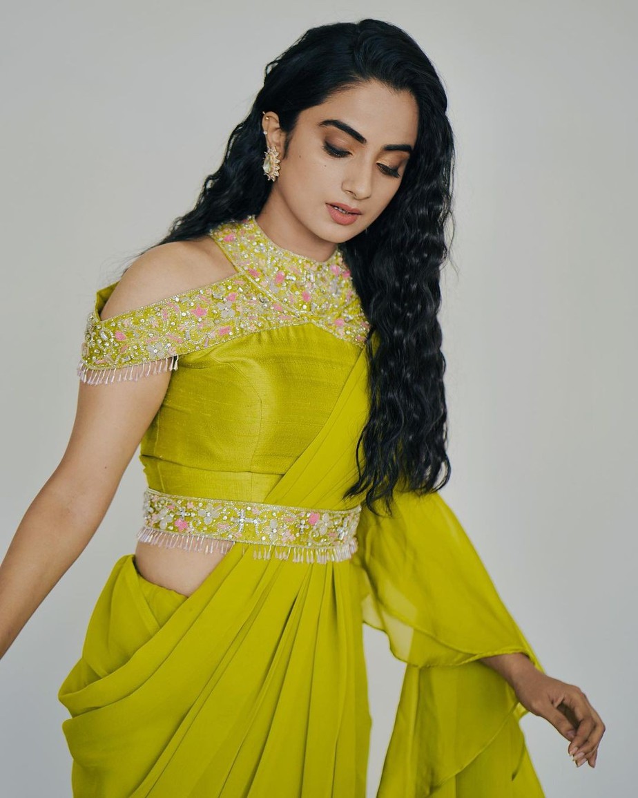 Ruffle sarees have enjoyed a steady base of admirers ever since their inception. It has been able to capture the hearts of our celebrities more than anything thus making way into ours as well. While you may be acquainted with a number of ruffle sarees in a number of hues, this one worn by Namitha Pramod for a show will certainly trump them all. This neon green saree is from Jeune Maree.