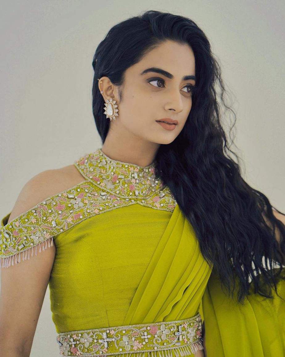 The fluorescent saree has its beauty attributed to the ruffles its displays on the trim and the hemline. Otherwise, it is sans embellishments or prints. Coming to the cold-shouldered blouse that also has a halter neck strap is adorned with stones and beads in pink. It also showcases intricate tassels on its hem. Lastly, an embellished belt to the likes of the blouse is wrapped around the waist.