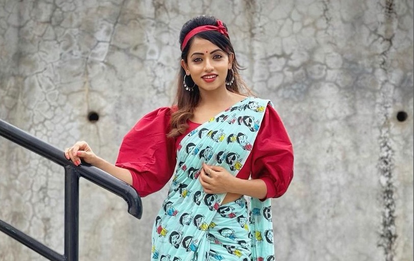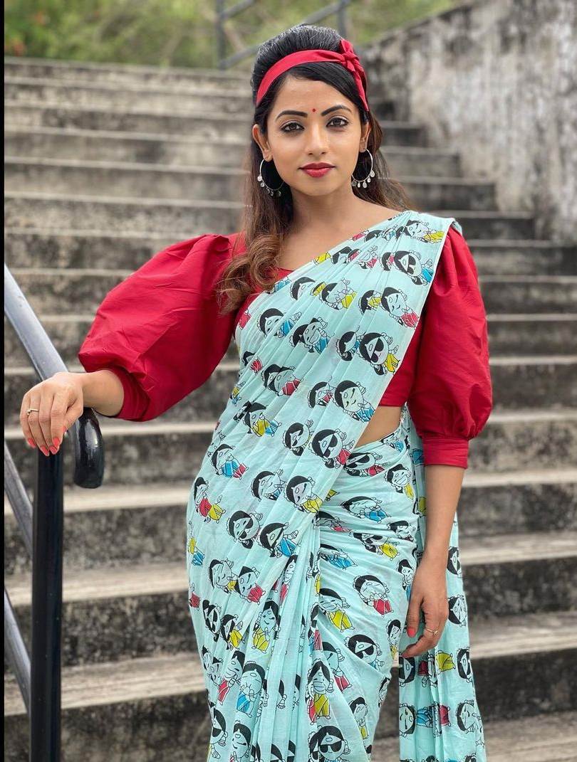 When it comes to life, we all like to live in the present and prepare for the future. However, when it comes to fashion, there’s no harm tuning into the past once in a while. Working with the motto, actress Navya Swamy decided to pull off a 70’s look in a printed saree by Riya Designing Studio.