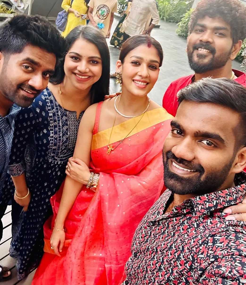 Vignesh Shivan on the other hand complemented his wife in a blood-red short kurta that is plain in nature and teamed up with an ivory veshti.