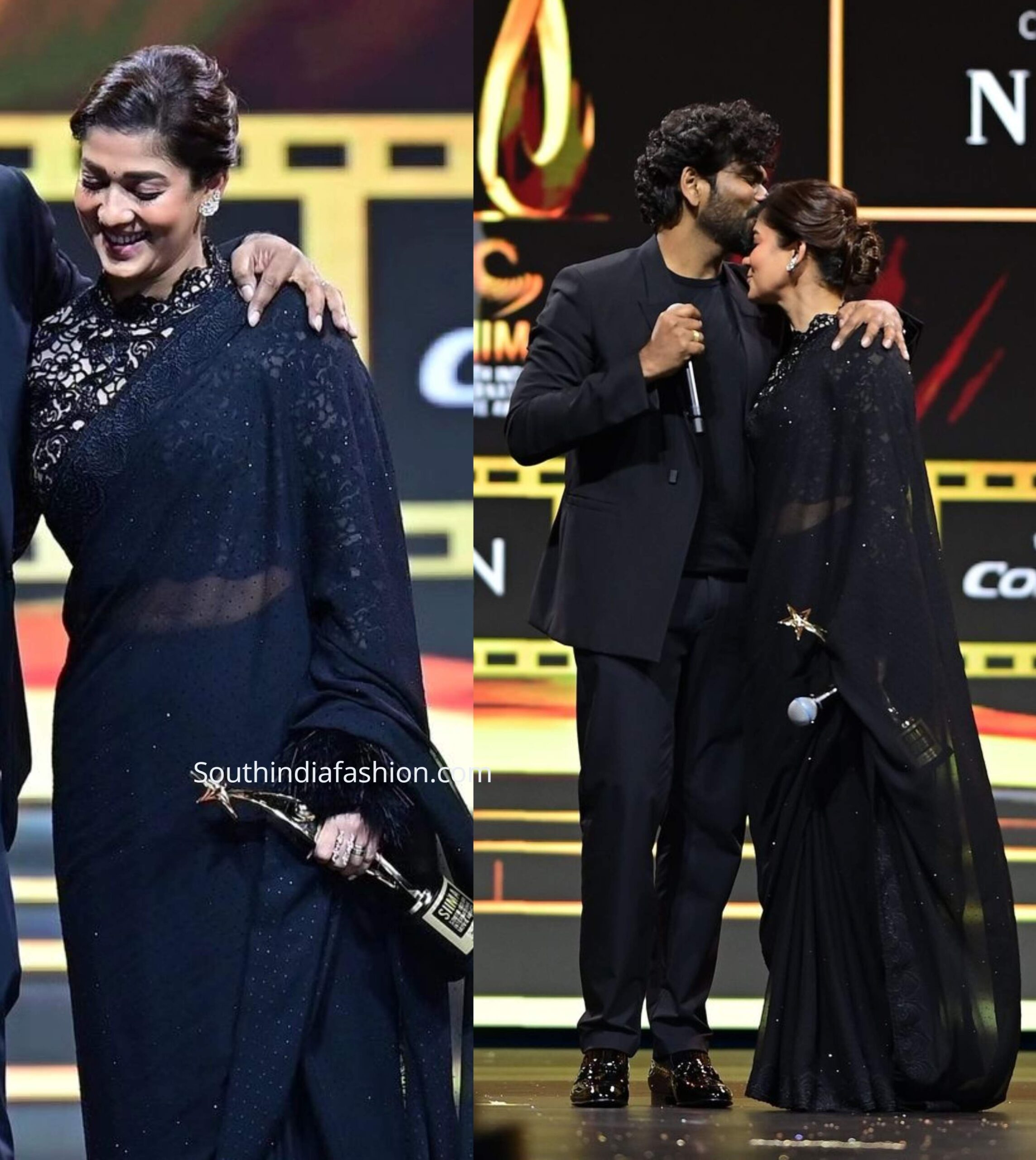 At the SIIMA awards in Dubai, Nayanthara turned heads in a stunning black sari. Her outfit featured a blouse with a unique feather trim at the sleeves, adding a modern touch to the classic look. A pair of studs and a soft bun rounded out her look!