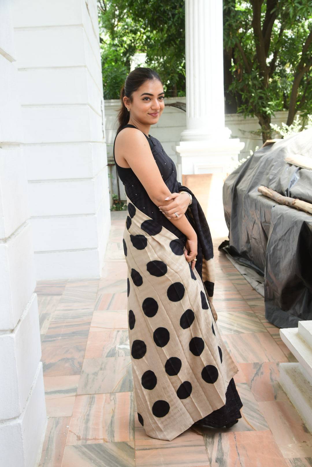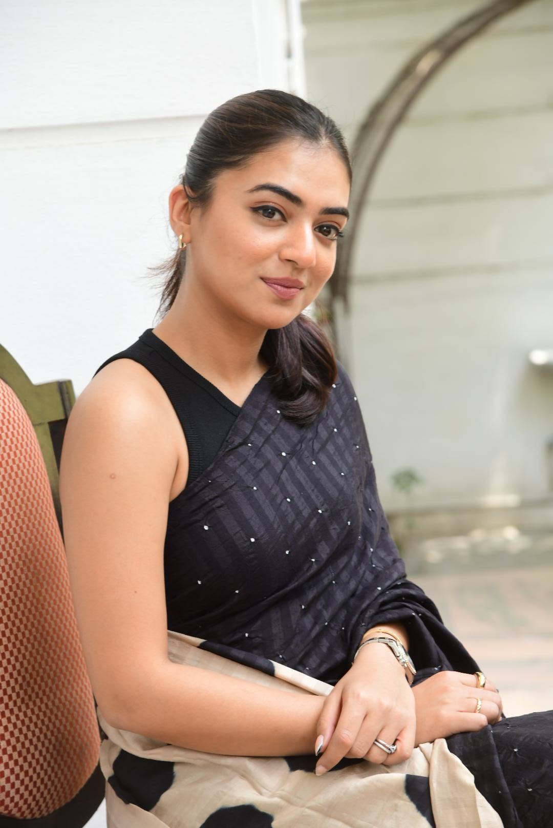 Actress Nazriya Nazim has been donning some pretty western and Indo western numbers for the promotions of “Ante Sundaraniki.” This is in tandem with her role as a Christian girl in the movie. However, none can escape the charm of a saree and that too a black one. So for the latest leg of promotions, she is seen wearing a black striped saree and we love it. Lesson in quirkiness