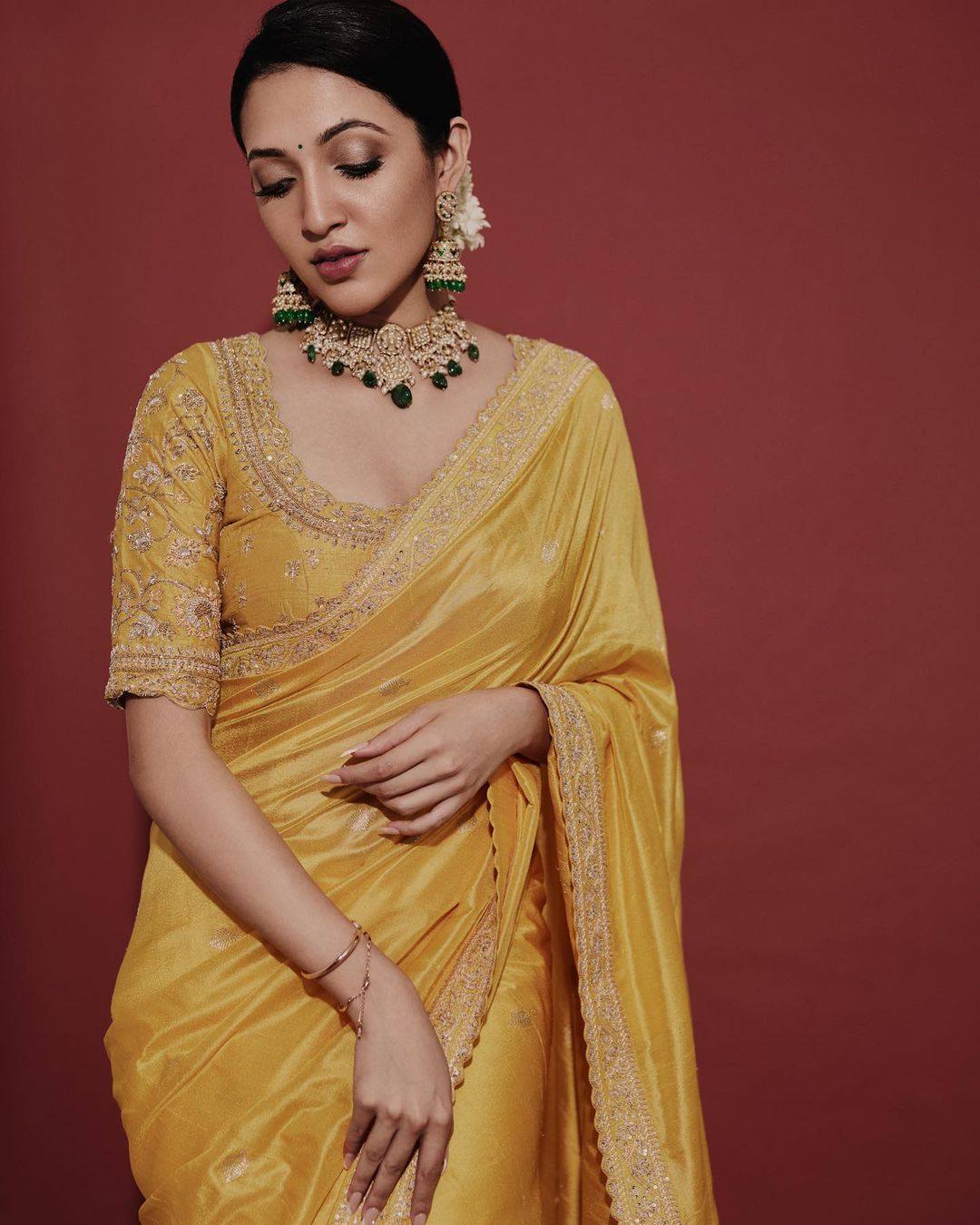 She accessorized the look with a pair of jadai earrings studded with emeralds, a neckpiece and a bangle by Paksha. A gajra adorned bun with kohl rimmed eyes, a bindi and dark lips elevated her look.