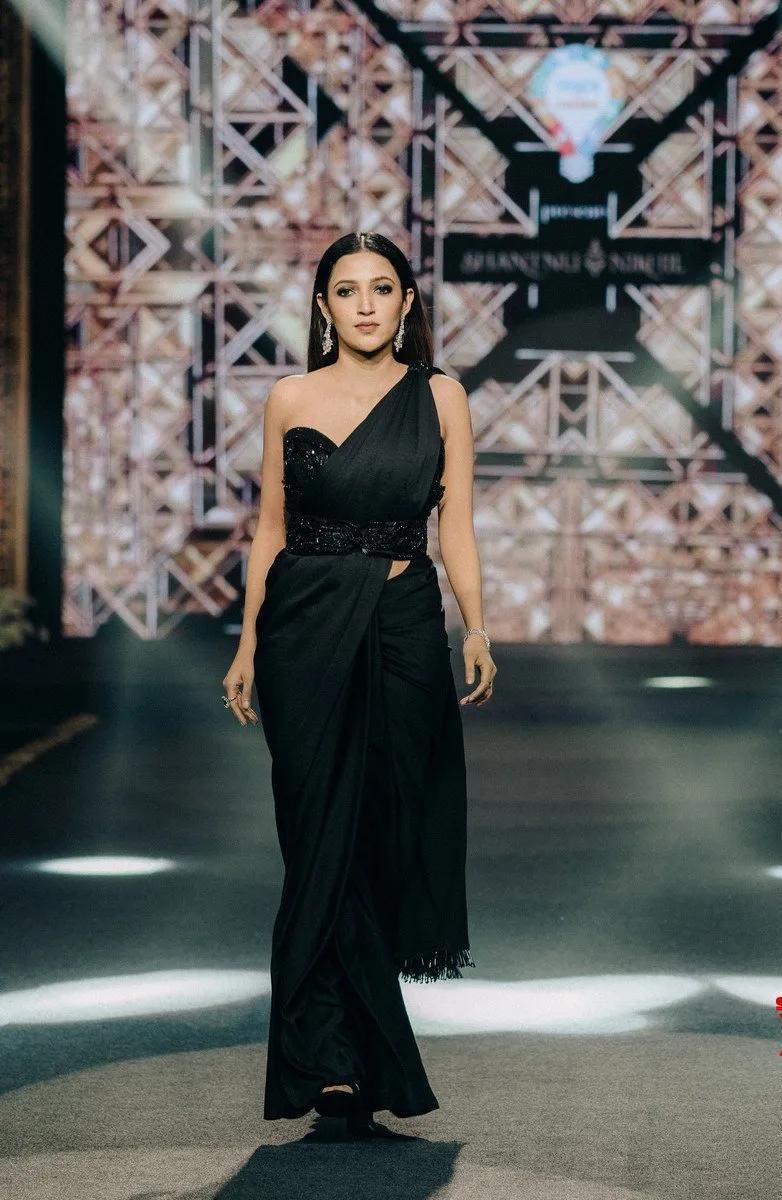 The Teach for Change fashion show event organized by Lakshmi Manchu in collaboration with designers Shantanu and Nikhil was a star-studded affair. A number of prestigious names from the Tollywood industry walked the ramp for a cause and one of them was actress Neha Sshetty. Neha was seen in a black pre-pleated saree by the doyen designers.