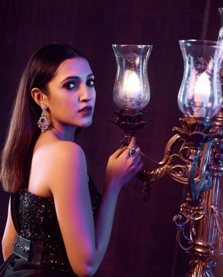 She styled it with a pair of emerald studded diamond earrings, a ring and a bracelet by Hiya Jewels. Her matching black shoes belonged to Centro Shoes. Slick back hair with kohl-rimmed eyes, blushed cheeks and dark lips magnified her look.