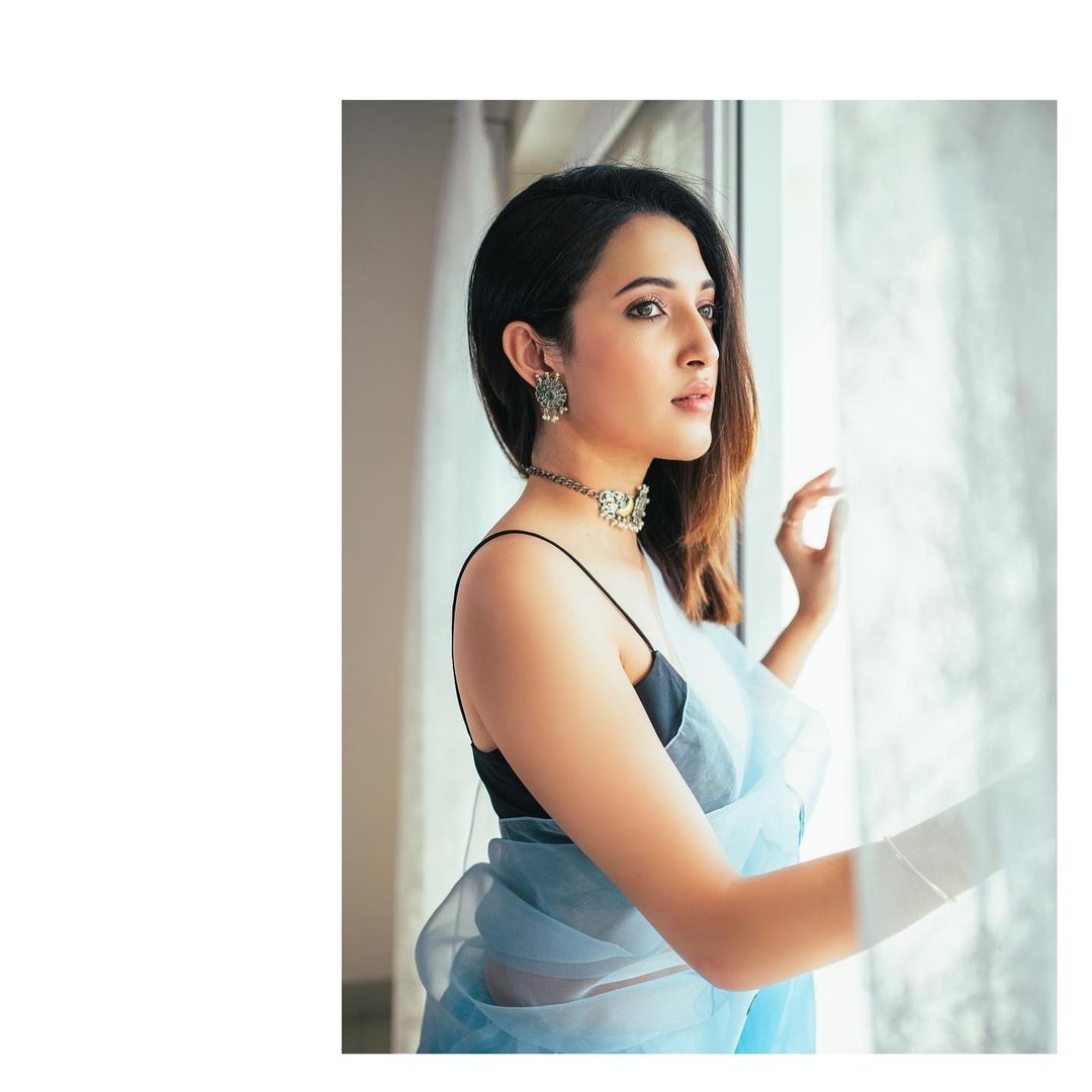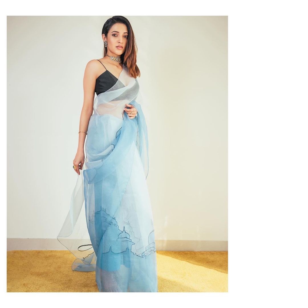 Who doesn’t fall in the charm of an organza saree? We believe the question is rhetorical. We all do and that too with our open hearts. While we might have a wide range of options to go about, here’s actress Neha Sshetty giving us one in a blue shade. This is designed by Geethika Kanumili for her Naveli collections.