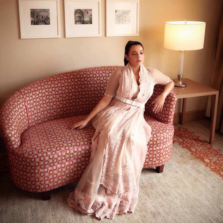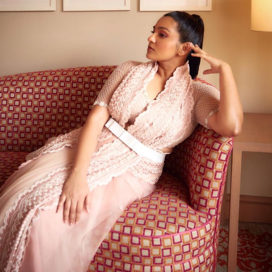 parvathy thiruvothu in a pink saree by archana rao for prime-1parvathy thiruvothu in a pink saree by archana rao for prime-2The sheer is beautified with lace detailing and glass beads all over its scalloped hem. However, the net saree is left plain towards its body and has its beauty attributed to the make. She wore the pallu over the neck on a blouse that matched the work on the saree. Lastly, a white signature belt completed things beautifully.parvathy thiruvothu in a pink saree by archana rao for prime-3
