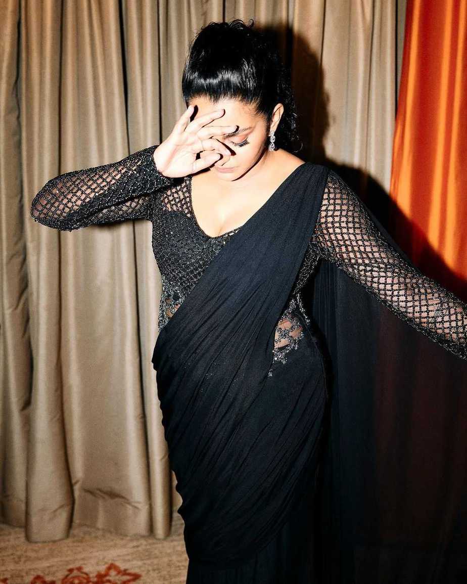 Saree gowns are immensely popular because of their unique silhouette and drape. Often a star at receptions or parties, this one sure deserves all the love it gets. If you are in search of one, this black number worn by Parvathy Thiruvothu seems to be your perfect choice. The outfit is designed by Sonaakshi Raaj.