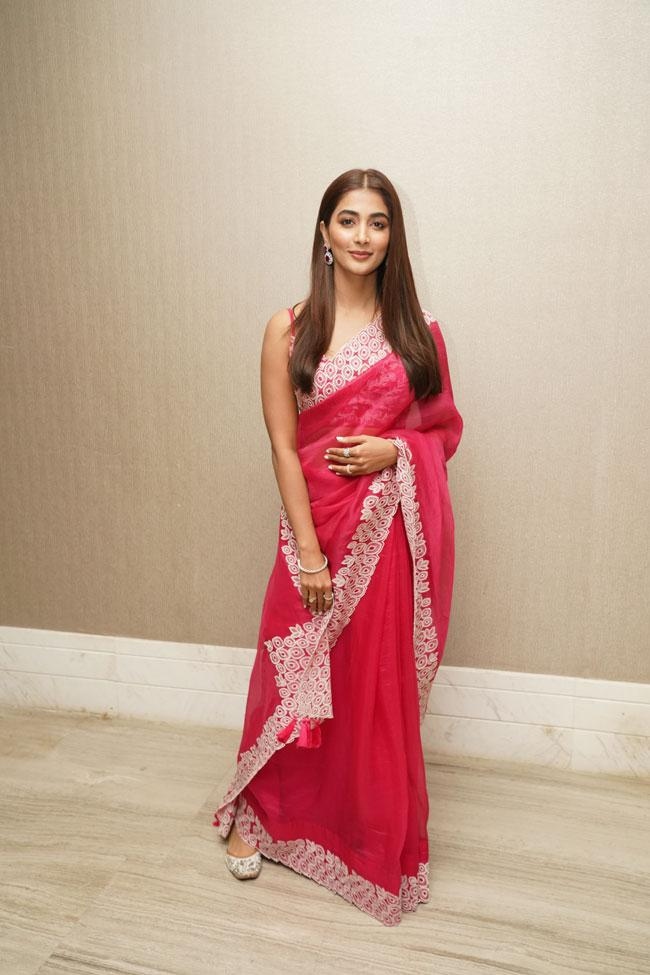 Actress Pooja Hegde has been the busiest actress this year. The beauty has already had some major releases across different languages. Adding another feather to the cap is Chiranjeevi starred “Acharya” which is slated for a May release. For a promotional interview for the movie, she wore a Fuschia pink saree by Devnaagri.