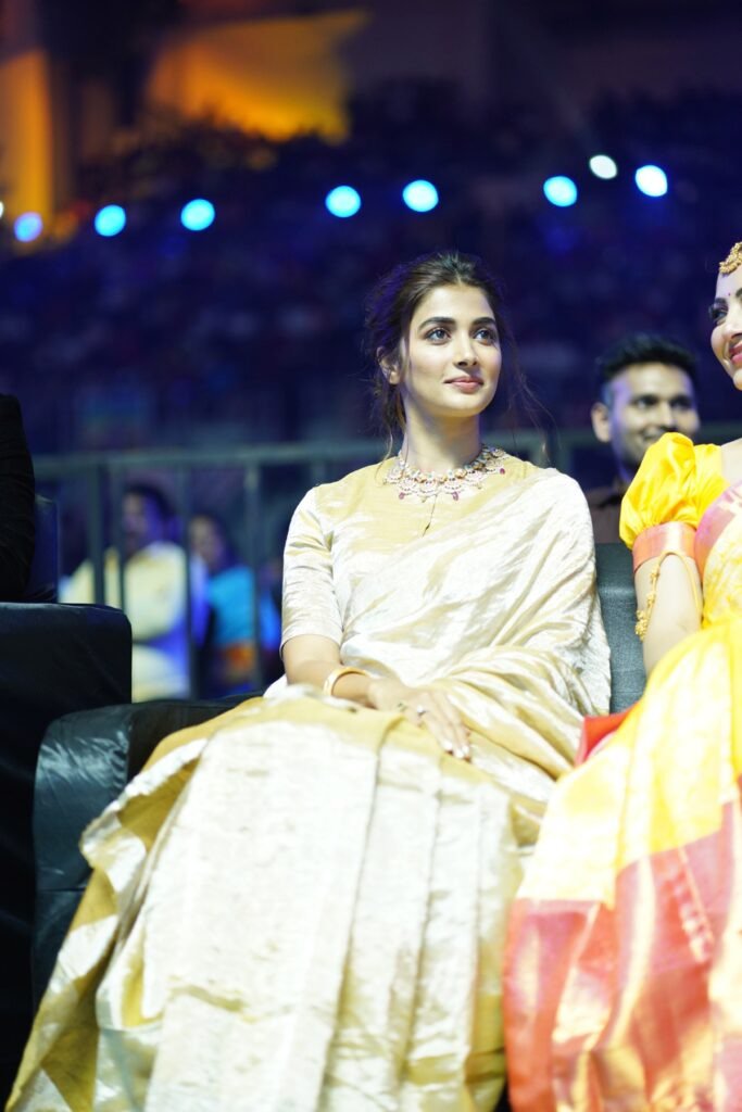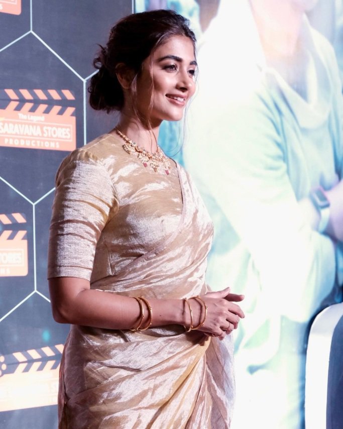 Actress Pooja Hegde seems to be on a roll. After taking all the love we have for her looks at Cannes, Pooja is back in town and is not done slaying. She was clicked last day at “Legend’s” trailer release in a gold saree by Anavila. This is from their Kaas’22 collections.