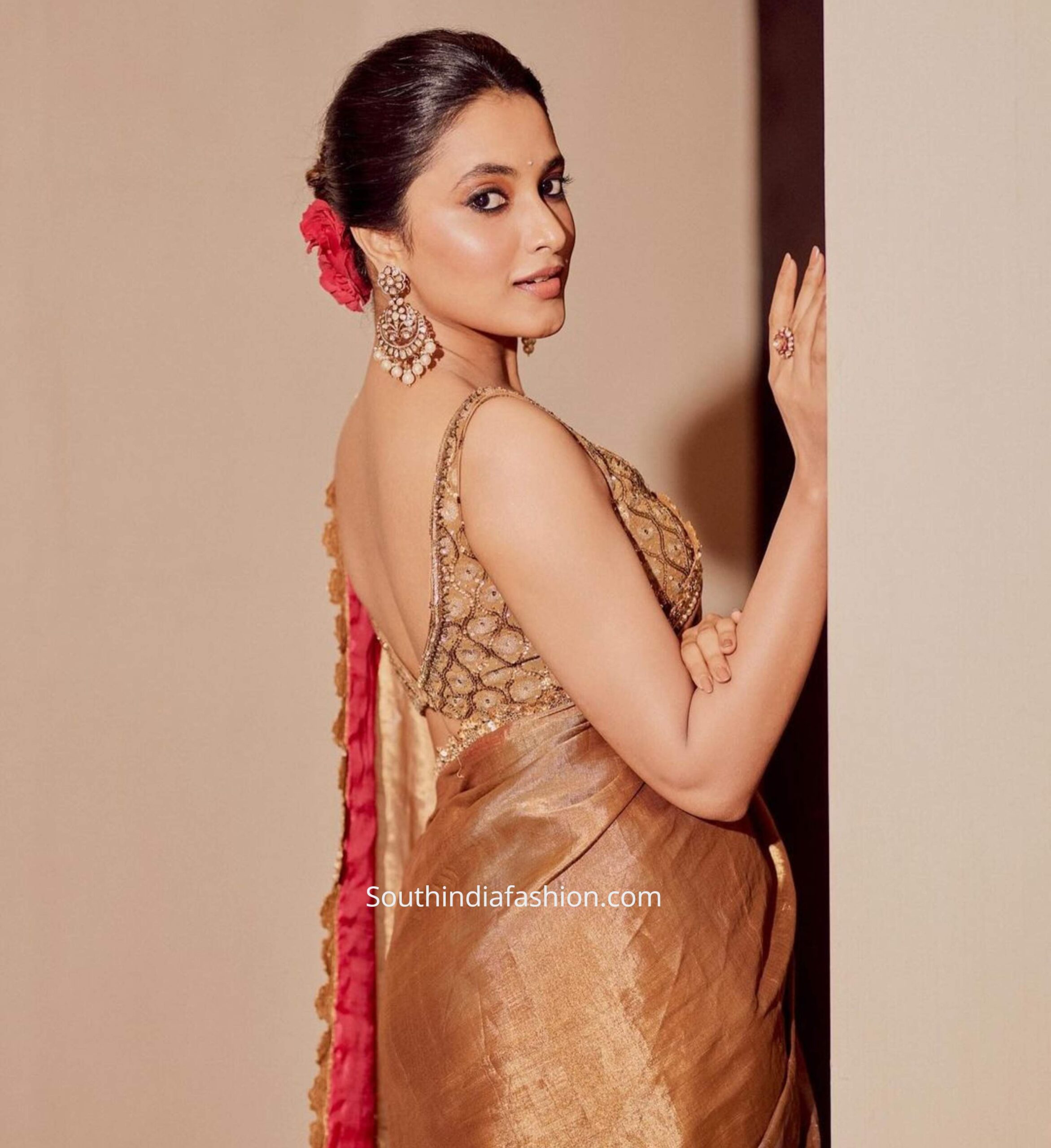 This Onam, Priyanka Mohan dazzled in a tissue saree designed by Sawan Gandhi. The saree’s translucent fabric shimmered beautifully, paired with a matching embellished sleeveless blouse that added a touch of sophistication.