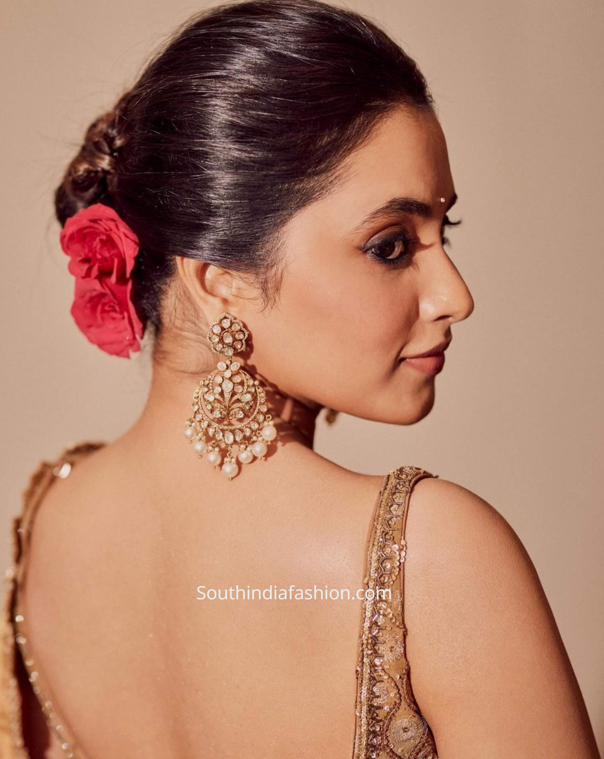 Priyanka complemented her look with statement polki chandbalis from Jatin Mor Jewels, which added a regal touch. Her kohled eyes and a chic bun decorated with fresh roses completed the festive look with grace and elegance.