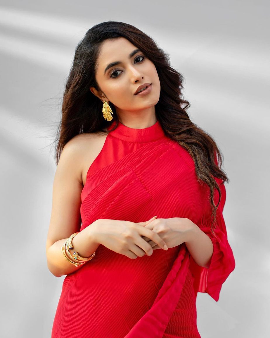 Priyanka Mohan in red faabiiana saree for jfw awards'22-2Pleated sarees are known for their plain body and sans embellishments make. So, this one too followed the suit and had its beauty attributed to its pleated make. Moreover, she teamed the saree with a plain halter neck blouse in silk.Priyanka Mohan in red faabiiana saree for jfw awards'22-1