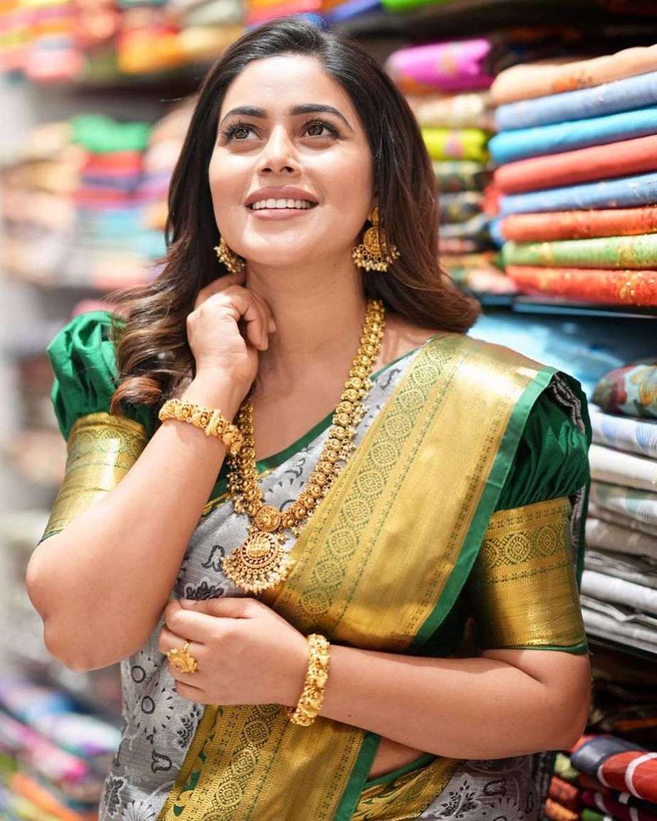 Actress Purnaa has reached new popularity with her big-budget projects and movie offers. The actress who is also a judge on a few dance reality shows also attends some inaugural functions and often gathers a huge crowd. Recently, Purnaa was spotted at a mall opening in Hyderabad in a grey silk saree by Zinna collections. The beauty overwhelmed us with her saree choice, to say the least.
