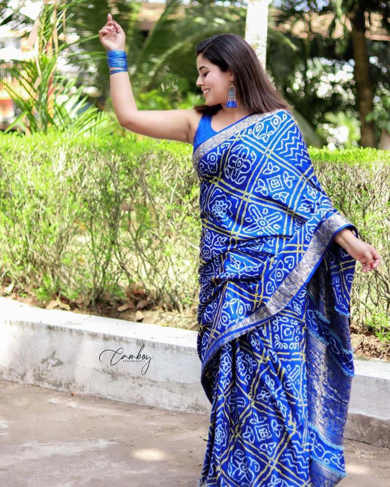 The saree in banrasi georgette features Bandhani prints native to Kutch all over its body in lighter shades. In fact, it varies from yellow to white and is handcrafted with a zari border in silver. It is paired with a sleeveless silk blouse that has no prints or embellishments.