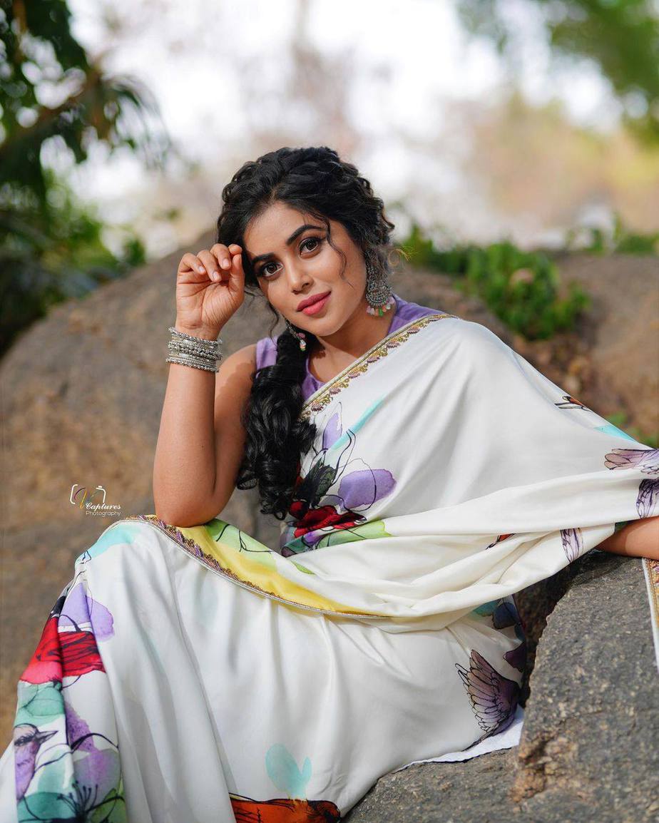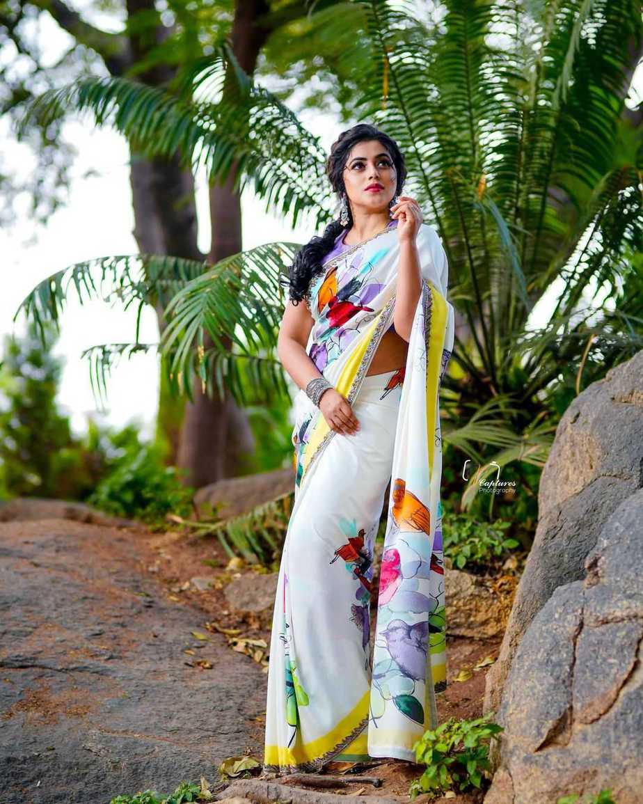 Designer Bhargavi Kunam‘s designs are revered all over India. The designer exclusively makes fashionable ethnic attires that steal your heart the moment you lay your eyes on them. Whenever she launches a new collection, the outfits are a sure shot choice for most actresses. The latest one to join the bandwagon is actress Purnaa who wore an ivory saree from the designer’s Vivid’21 collections.