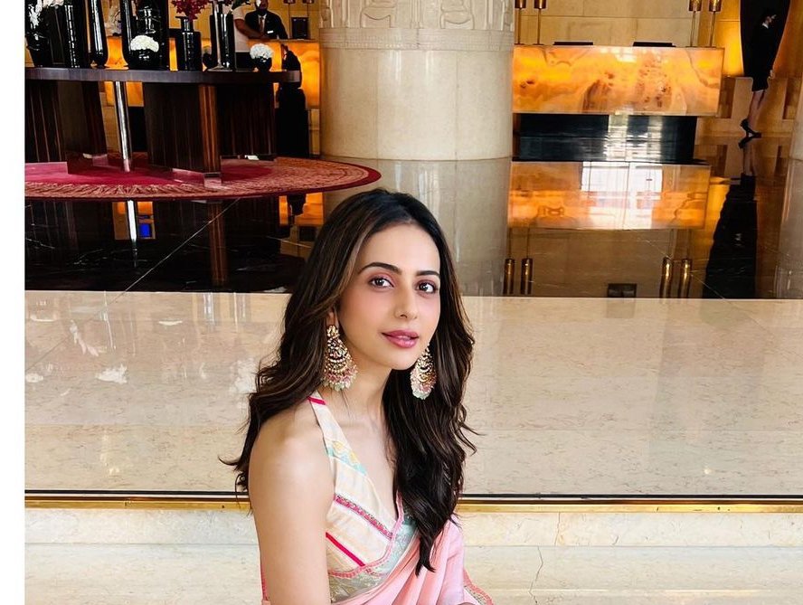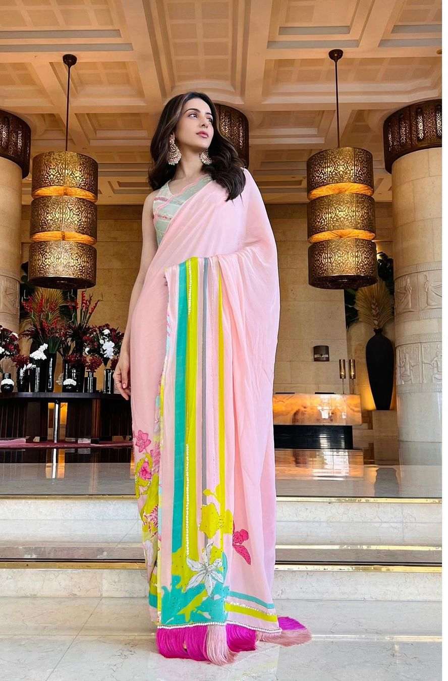 Actress Rakul Preet Singh is always known to ace every outfit she ever dons. The beauty has a unique style sense which includes both western and Indian outfits. Recently the actress had to attend a wedding and she decided to give us some major sartorial goals. Rakul wore a pink saree by Raji Ramniq. The drape is from their Dream a Little collection.