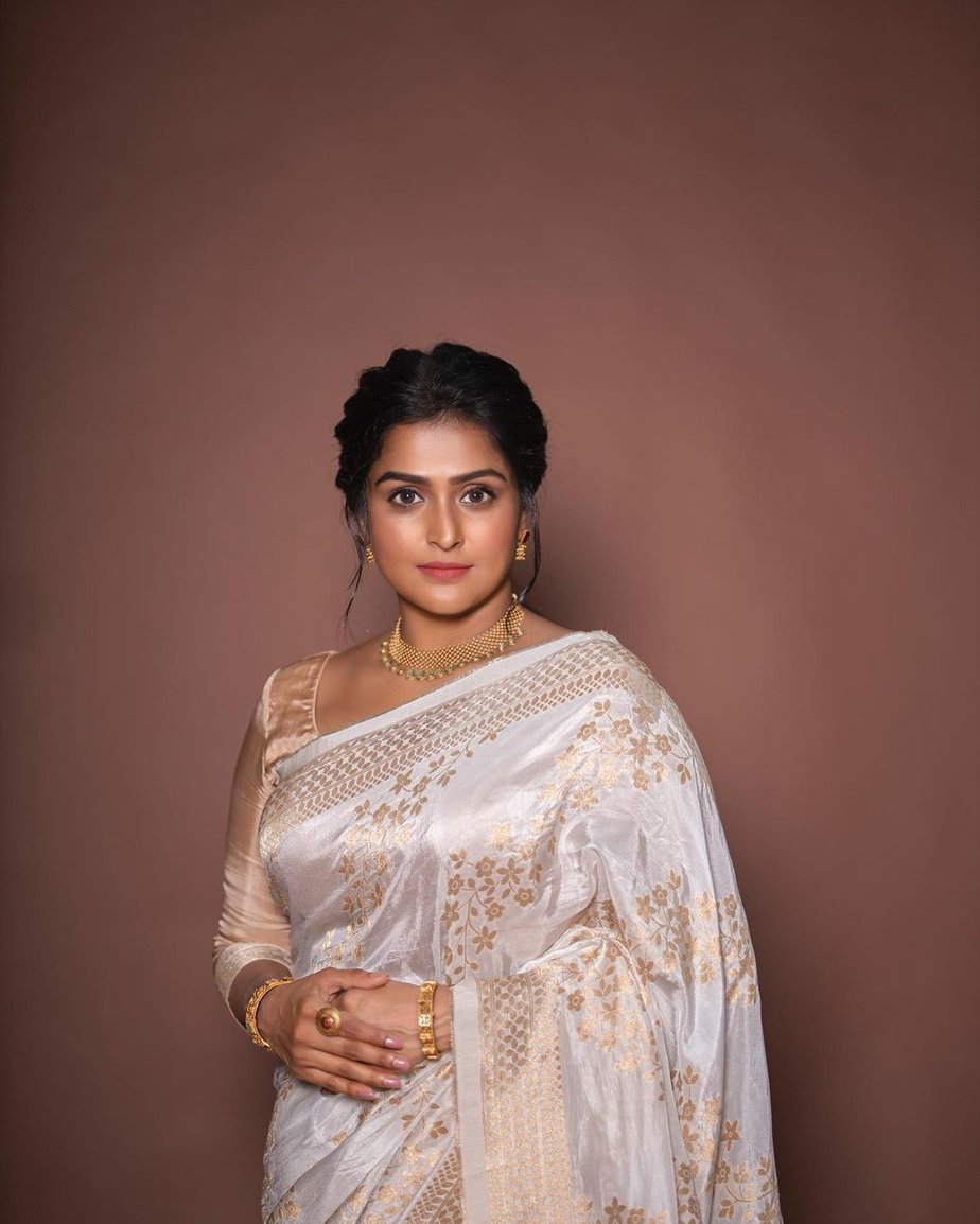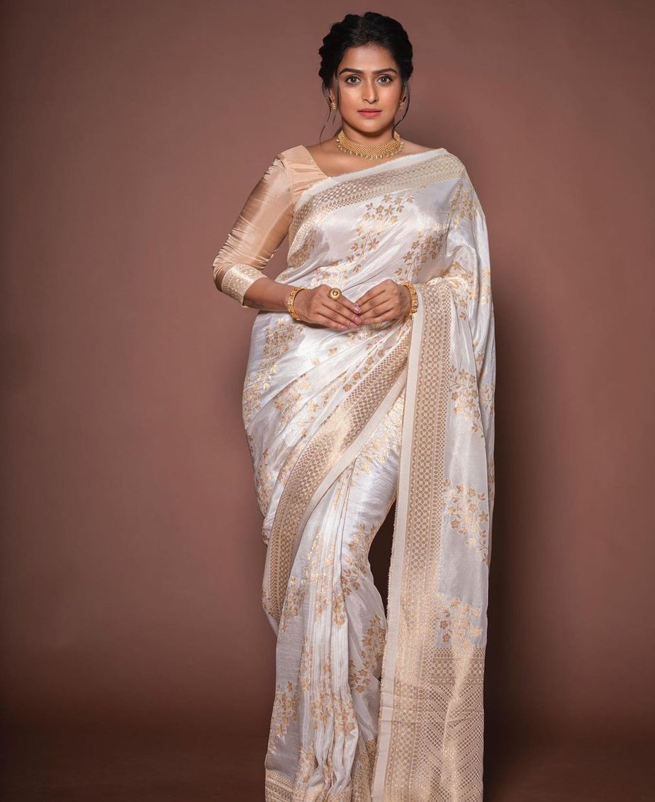 ramya nambessan in an ivory saree by ah design2The saree in silk is worked with zari on its body which brings out the beauty of dainty floral jaals. However, the border is worked with diamond motifs in gold to give it a contrast. The pallu on the other hand is striped in gold taking cues from the border. It is paired with a gold full-sleeved blouse with kasavu detailing.