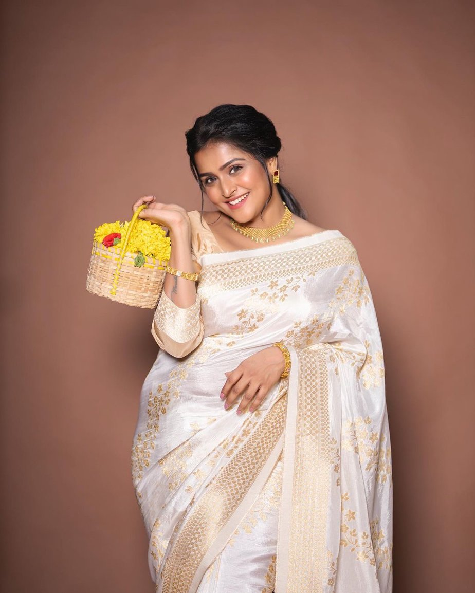 Ramya Nambessan channels the Onam vibes in an ivory Kerala saree! Celebrity Sarees
