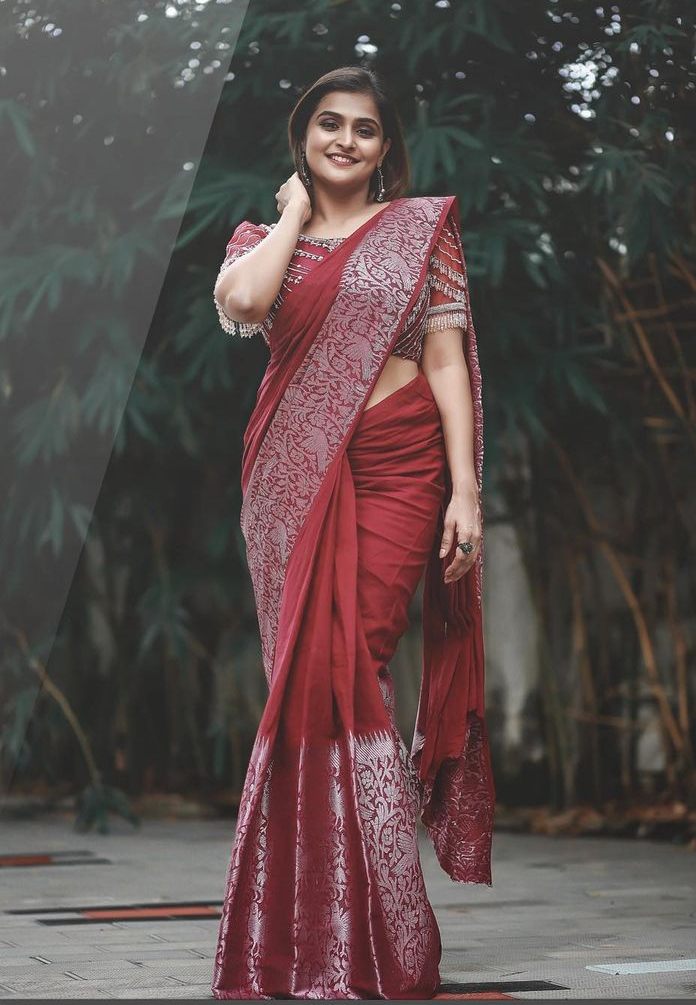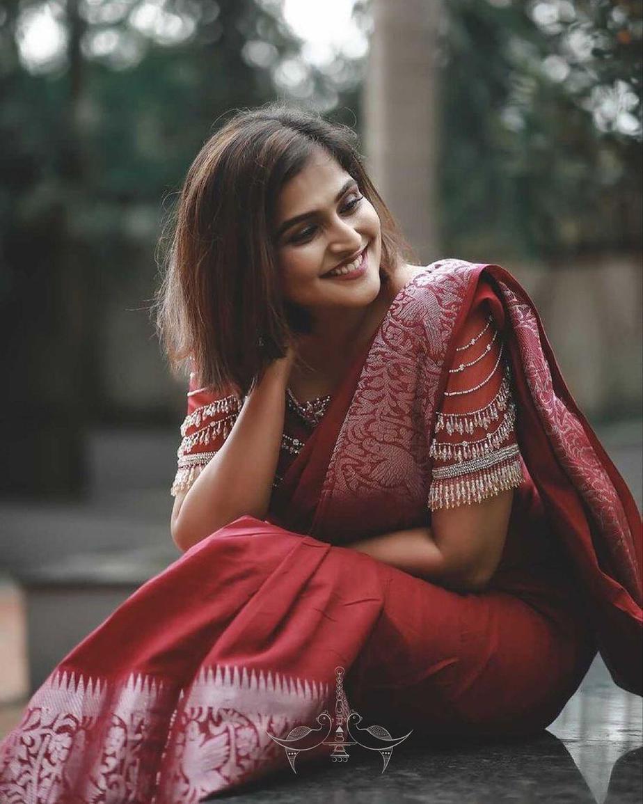 Though we all love how our actresses pull off chic looks in western outfits, nothing matches the joy of seeing them rocking a saree or a lehenga. This is especially true for some beauties like actress Ramya Nambessan. And granting our wish true, the singer-actor’s latest post has her looking wow in a red saree by Studio Virupa.