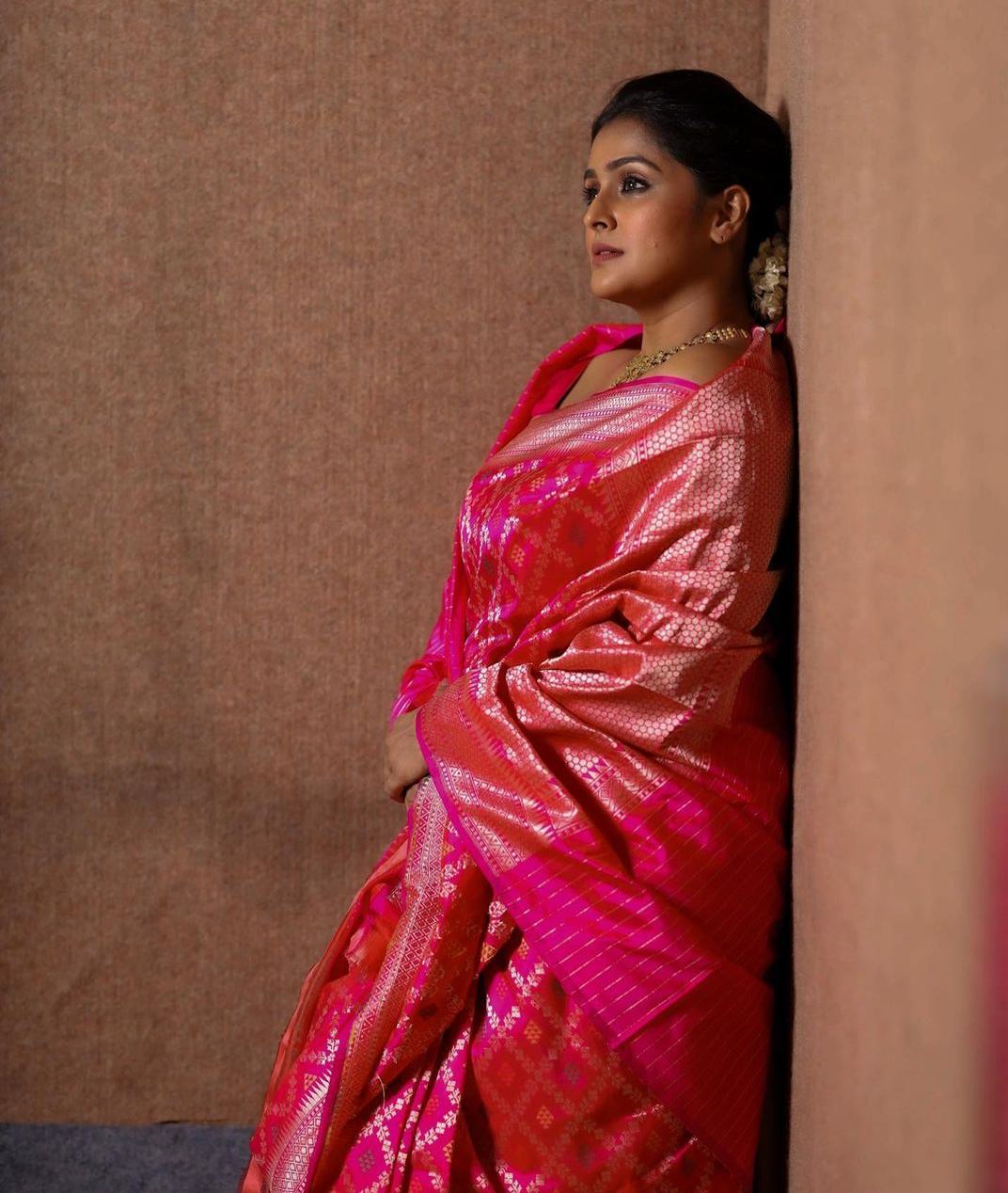 Ruby pink sarees have always had a strong fanbase to flaunt. It is almost seen in every saree closet and is one of the most preferred colours after red. So as we have another season just around the corner, we believe this silk saree worn by Ramya Nambessan will do you some good. It is designed by Pastel Designs.