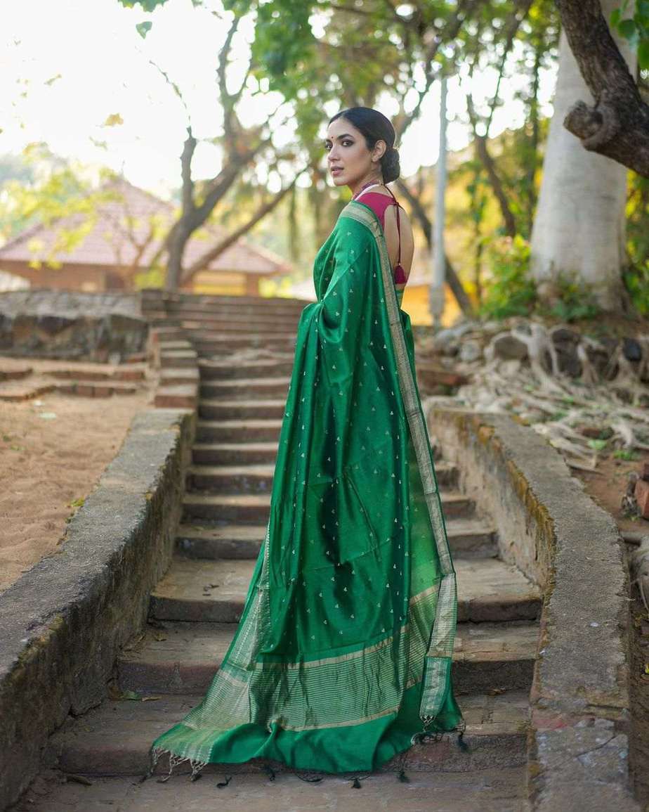 A silk saree never loses its charm and the reason for this is its beauty and grandeur. Silk sarees can infact be sophisticated or simple, just enough to give you the perfect Indian look. Actress Ritu Varma is certainly into the minimalistic ones. In her latest set of photos, the actress is seen wearing a green silk saree by Pothy’s.