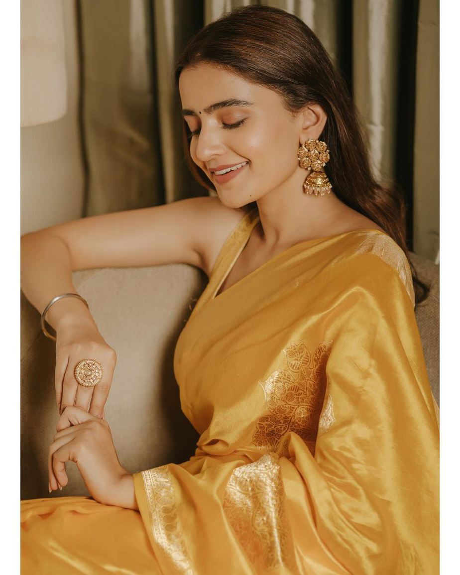 Actress Rukshar Dhillon is all set for the grand release of her movie “Ashoka Vanamlo Arjuna Kalyanam.” The cast and crew had held the pre-release event last day so the actress has already begun promoting the movie. For the first leg of promotions, she wore a mustard silk saree by Paaprika Store.