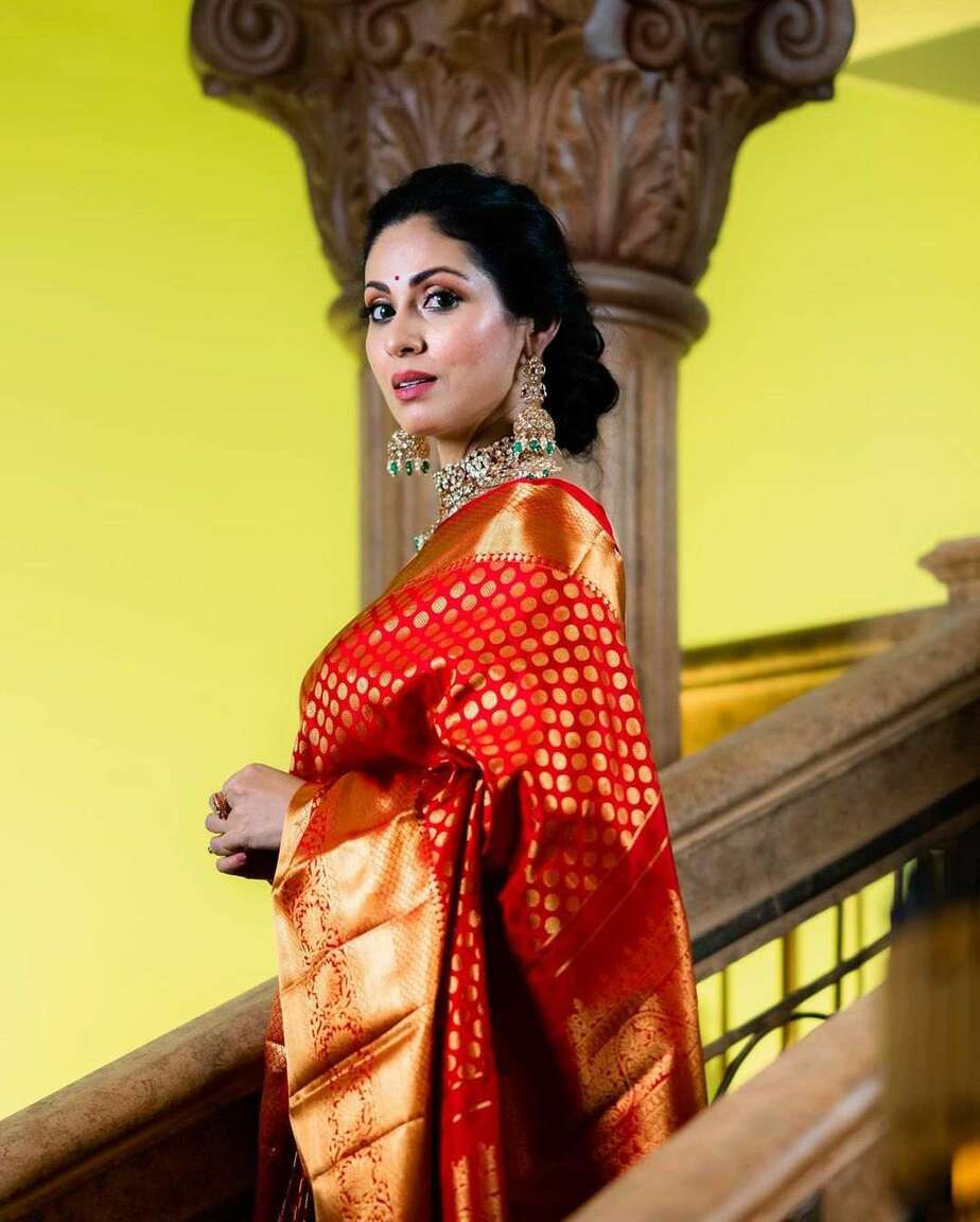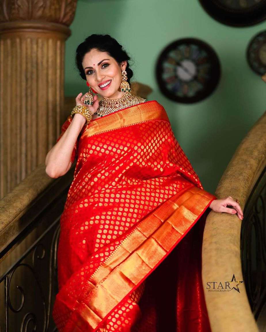 Actress Sadaa is no longer active in films but beauty still rules over hearts. In fact, proof of this is her latest clicks going viral on social media. In the pictures, Sadaa is seen in a red Kanchipuram silk saree by Brand Mandir for a photoshoot.