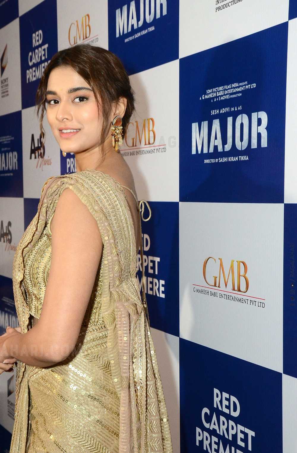 After a long wait, the movie “Major” has been released in the theatres and is already getting rave reviews from fans and critics. Before the release, the makers had arranged for a special premiere for some selected celebrities including Major Unnikrishnan’s parents. For the unversed, the movie is based on the martyred soldier’s life. For the occasion, Saiee wore a gold saree.