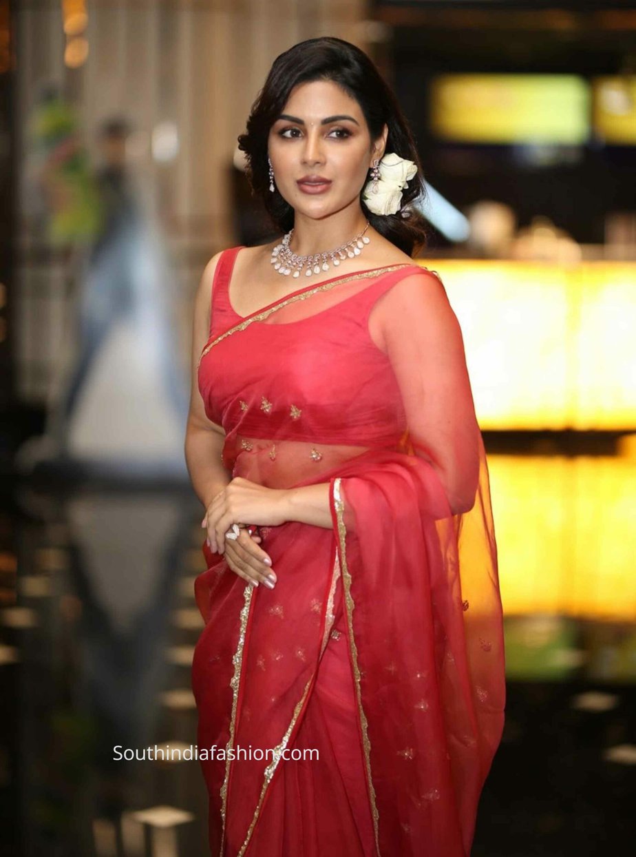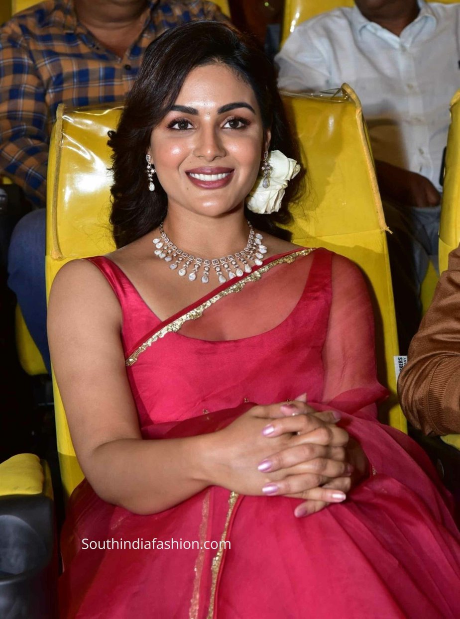 Samyuktha attended the trailer launch event of her upcoming movie Vaathi wearing a pink organza saree paired with matching sleeveless blouse. A simple white stones necklace set and soft curls decorated with flowers rounded out her look!