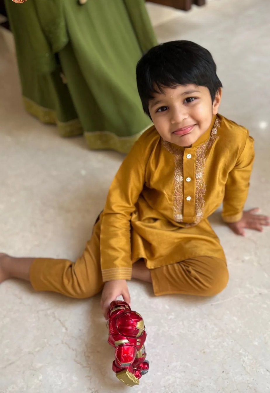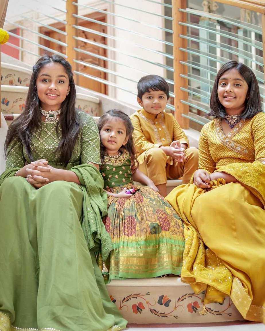 Vishnu Manchu and family never cease to stun us with their outfit choices. The family is known to wear coordinated outfits for each festival and we can’t wait for them to upload those pictures. For Ugadi this year, the family went with green-yellow hued traditional. These are designed by Label Vida.
