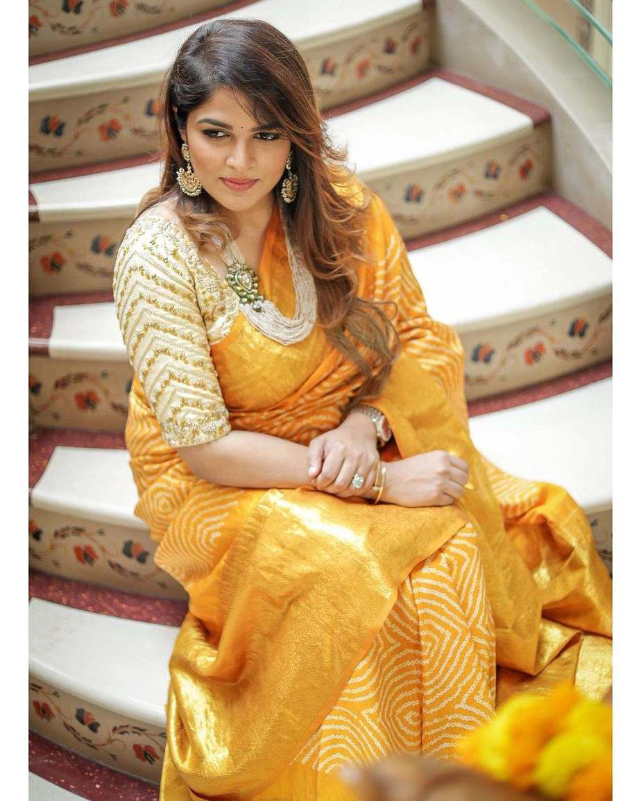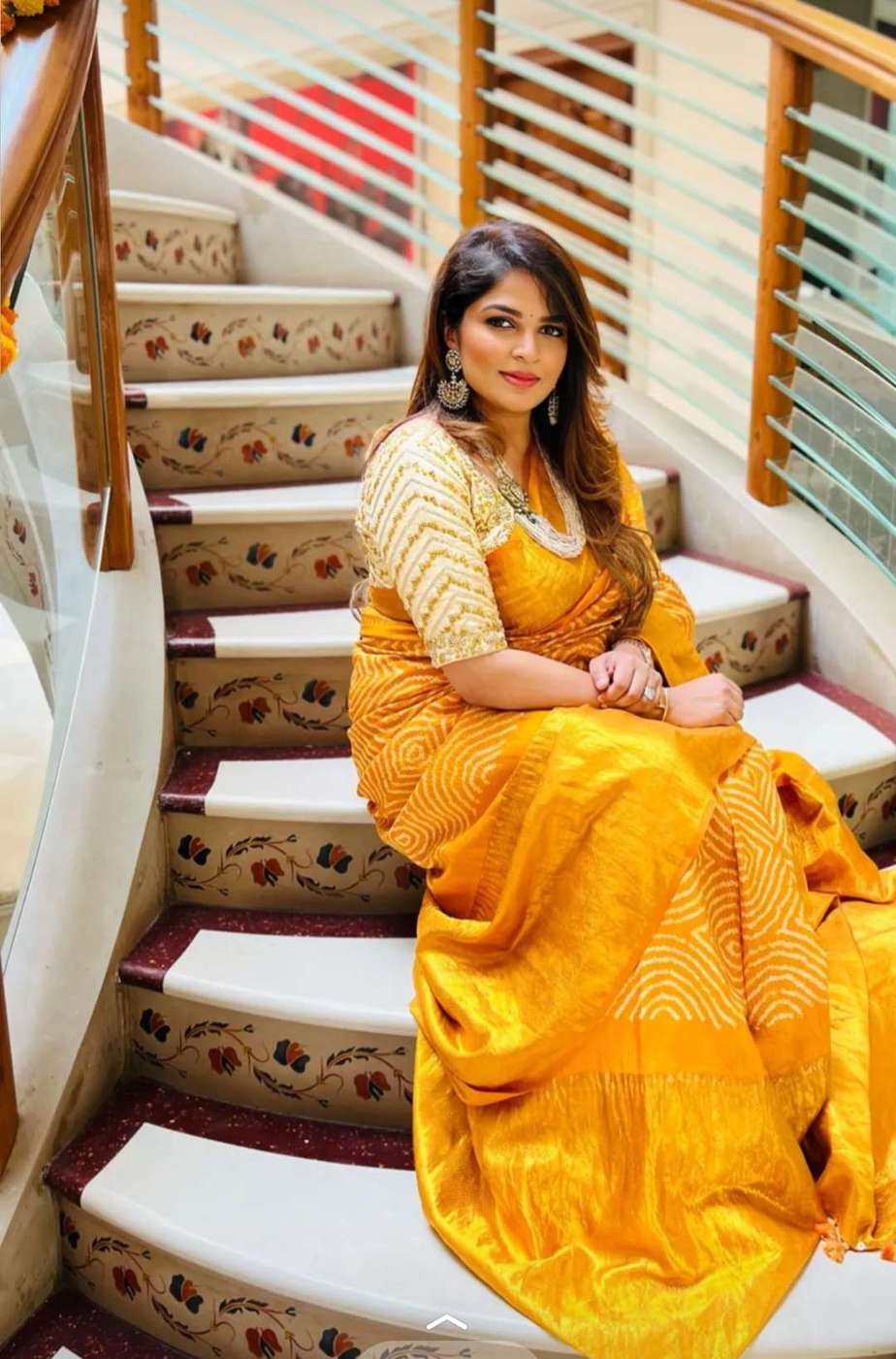 Viranica resorted to a yellow silk saree with bandhani prints all over in white. The pattu saree is paired with an ivory blouse embroidered with gold floral stones. She rounded out the look with a pair of earrings and a long neckpiece.