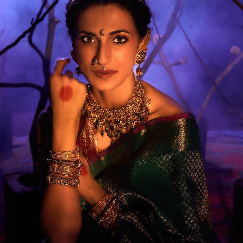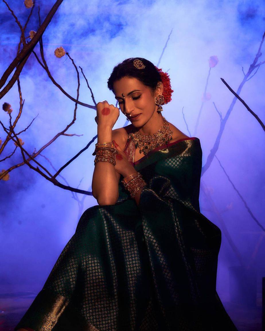 The deep green saree is latticed in gold on its body while the borders feature floral motifs in pattu on it. Moreover, the trim is also accentuated with a maroon piping. We also loved how the saree has silver and gold pattu detailing with tassels. She paired the saree with a halter necked pattu blouse with floral motifs on display in gold and green by Shilpa Reddy.