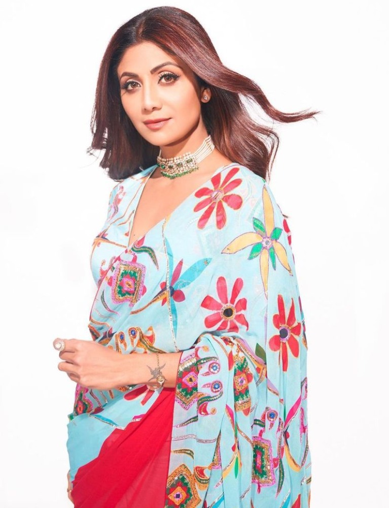 Shilpa Shetty Kundra regarded mesmerizing in her red-blue saree from the label Mayyur Girotra Official. Her saree had a large plain pink border, and her blue pallu had distinctive floral and bird-printed in bins. Alongside, she teamed her saree with an identical cut-sleeved blue shirt that featured comparable printing as that on her pallu.