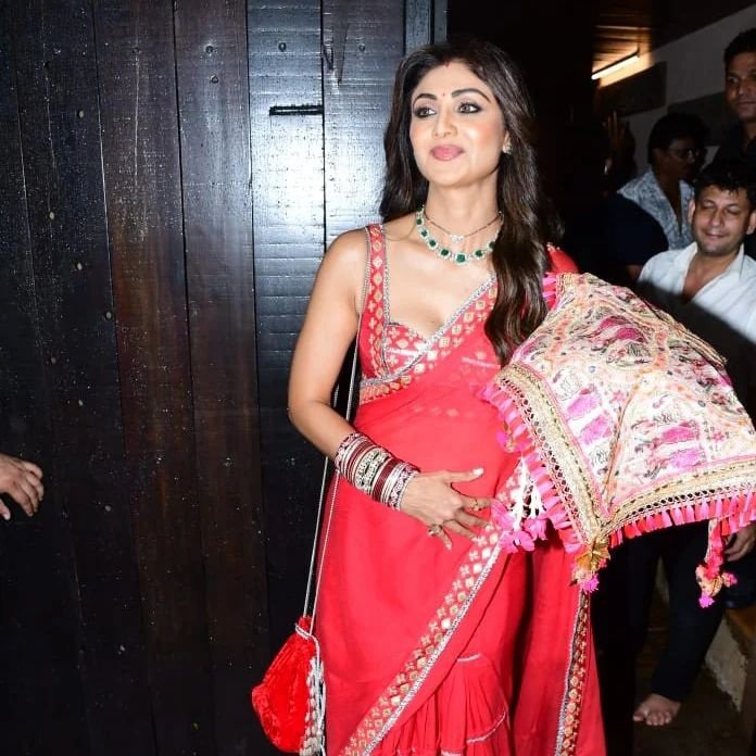 Every year actress Shilpa Shetty and her girl gang celebrate Karwa Chauth together in a grand manner. This year as well, all of them gathered at Sunita Kapoor’s wife’s and saw a lot of celebrity faces as well. For the puja, Shilpa wore a red pre-draped saree by Gopi Vaid Designs from their new exclusive collection.