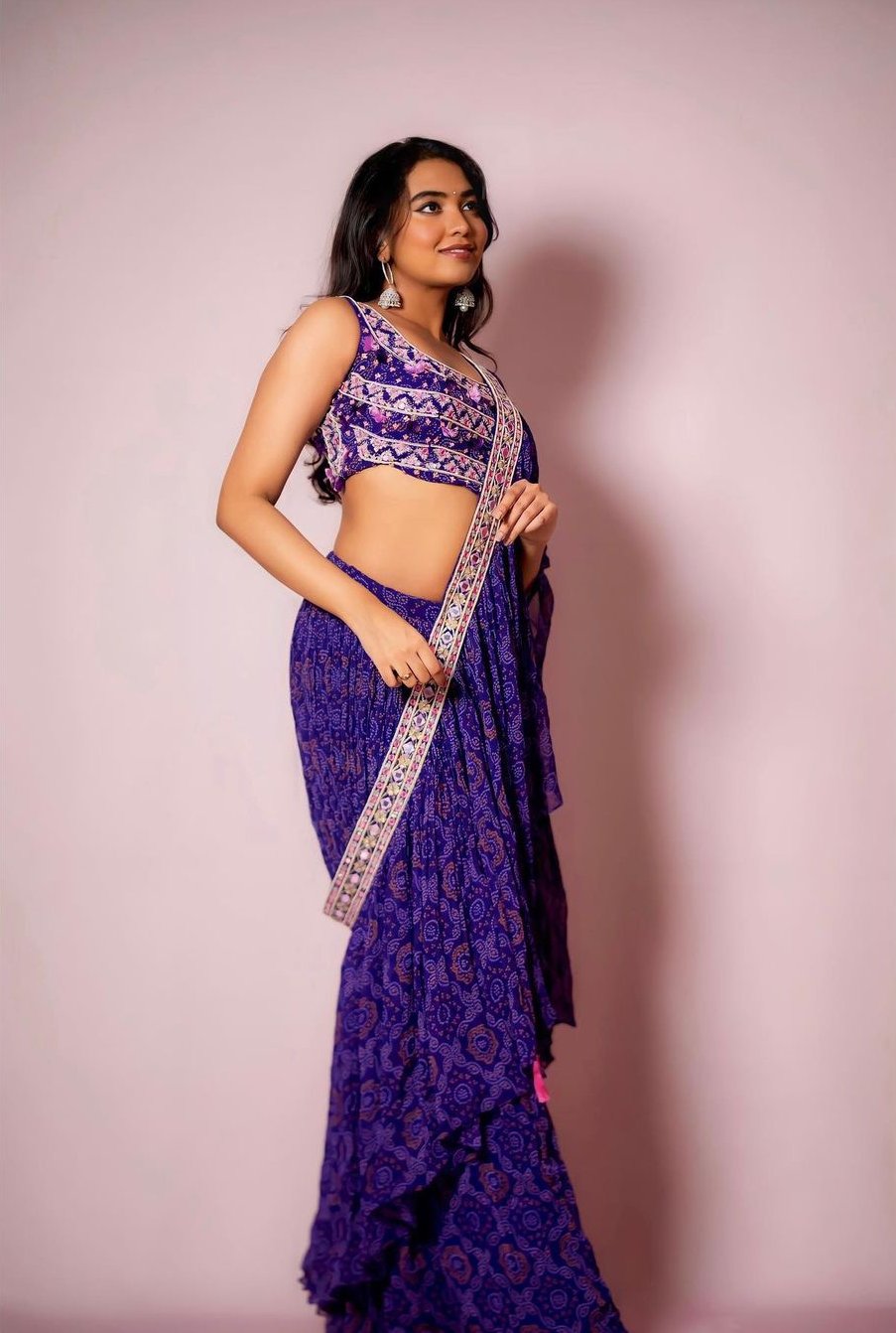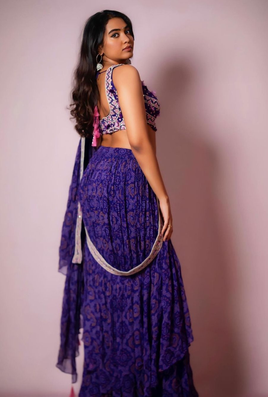 Pre-draped sarees are so stylish that they have been dominating all of the ramps. Our celebrities also have been donning these beauties for parties and events. Recently for a wedding actress Shivathmika had to attend she wore a purple pre drape saree that we have set our eyes on. This one is designed by Issa designer studio for their Dheri Couture’22.