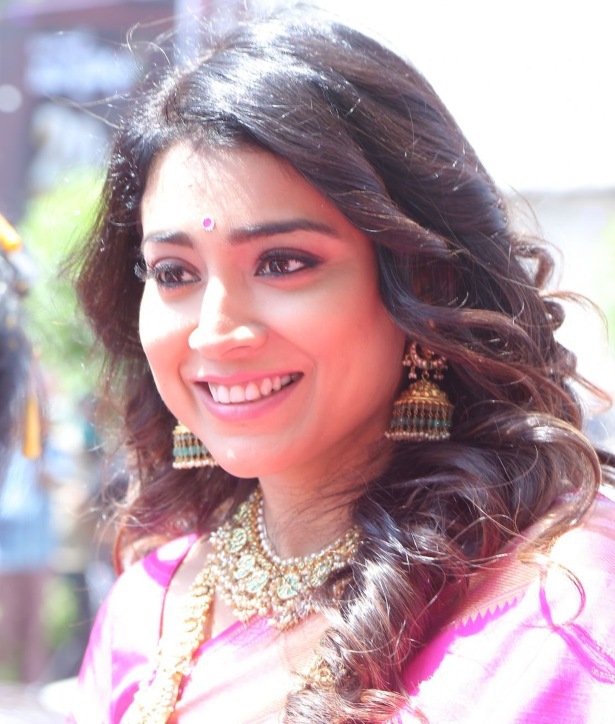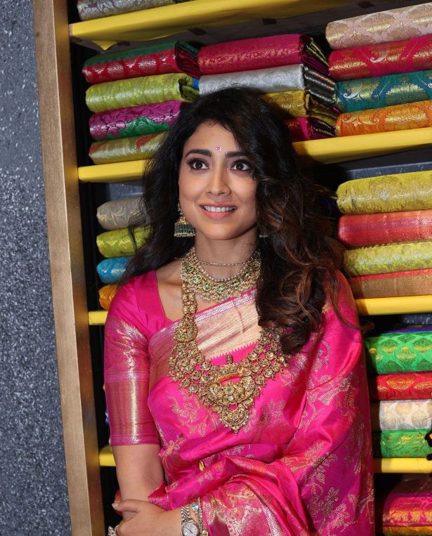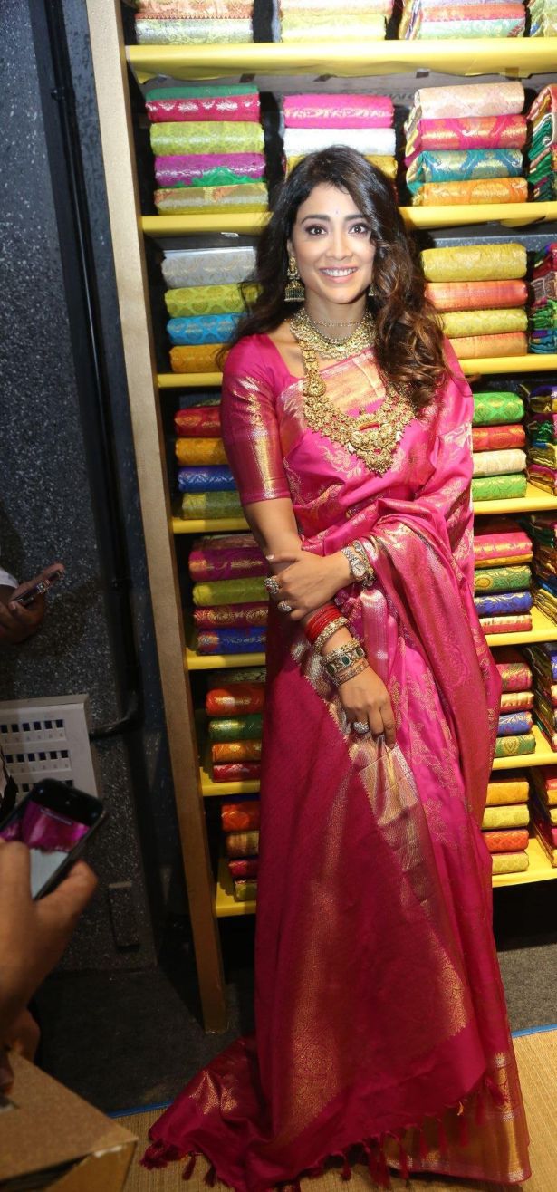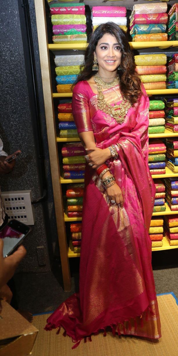 Shriya Saran dresses up in a pink pattu saree for a shop opening! Celebrity Sarees