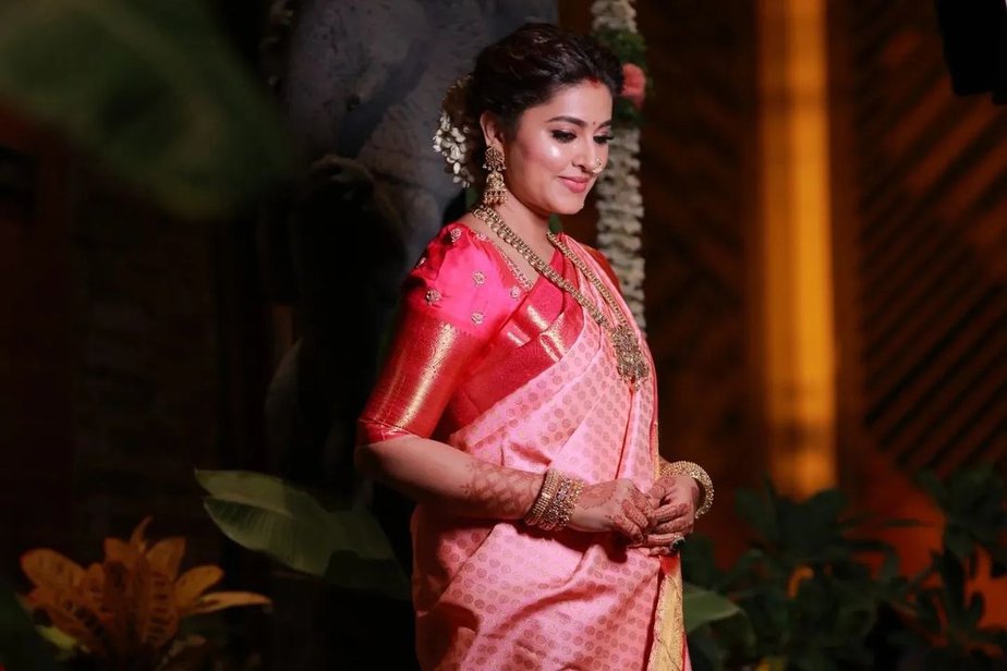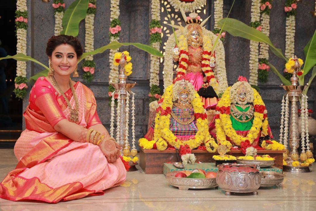 Actress Sneha Prasanna makes it a point to give a glimpse of the festivities she celebrates as a family. Without breaking the order, this time she gave a sneak peek into the Varalakshmi Vratham ceremony at her home. For the occasion, she wore a pink saree by Geethu Haute Couture.