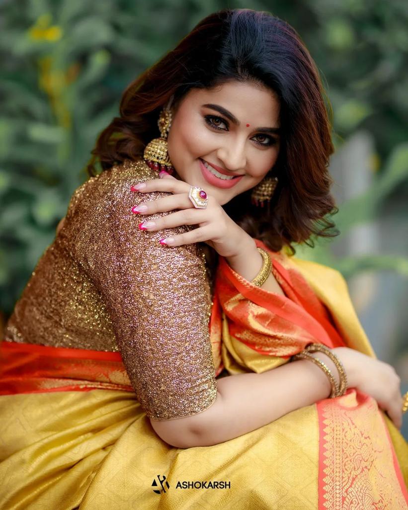 We all love how actress Sneha Prasanna puts a lot of effort into each attire she dons for the reality show she has been judging. The beauty chooses one that complements the theme of the programme and this week it is traditional. So Sneha is seen wearing a cyber yellow saree from her own wardrobe.