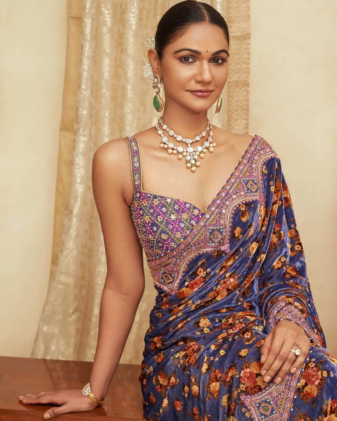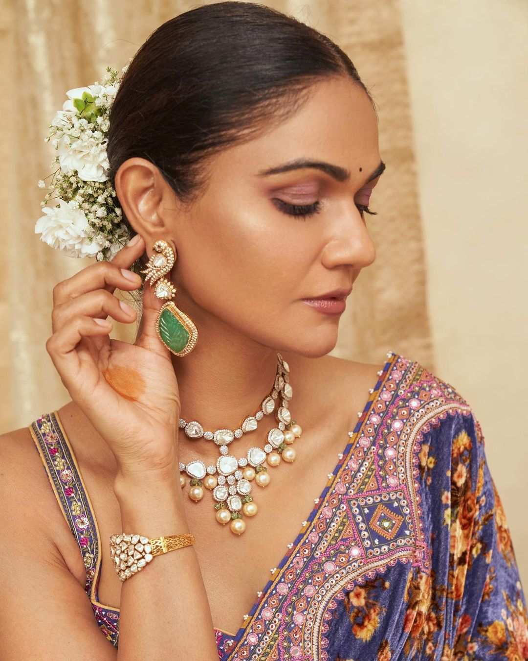 She accessorized the look with a pair of emerald studded diamond earrings a choker, and a bracelet by Archita Naryanan Jewellery. She rounded out the look with a simple floral hairdo,kohl-rimmed eyes bindi, and muted lips complemented the look.