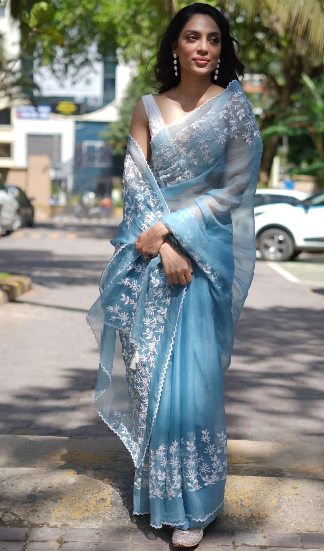 The sheer light-hued saree has its beauty rested upon the plain body. However, its borders are beautified with intricate floral hand embroidery in white. Its hemline on the other hand is also scalloped with these details. She paired it with a white lace detailed sleeveless blouse.
