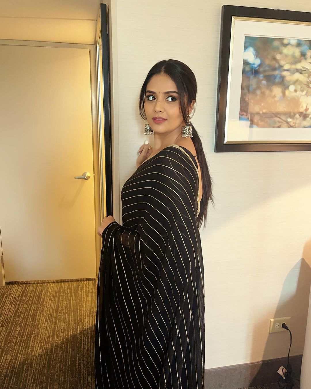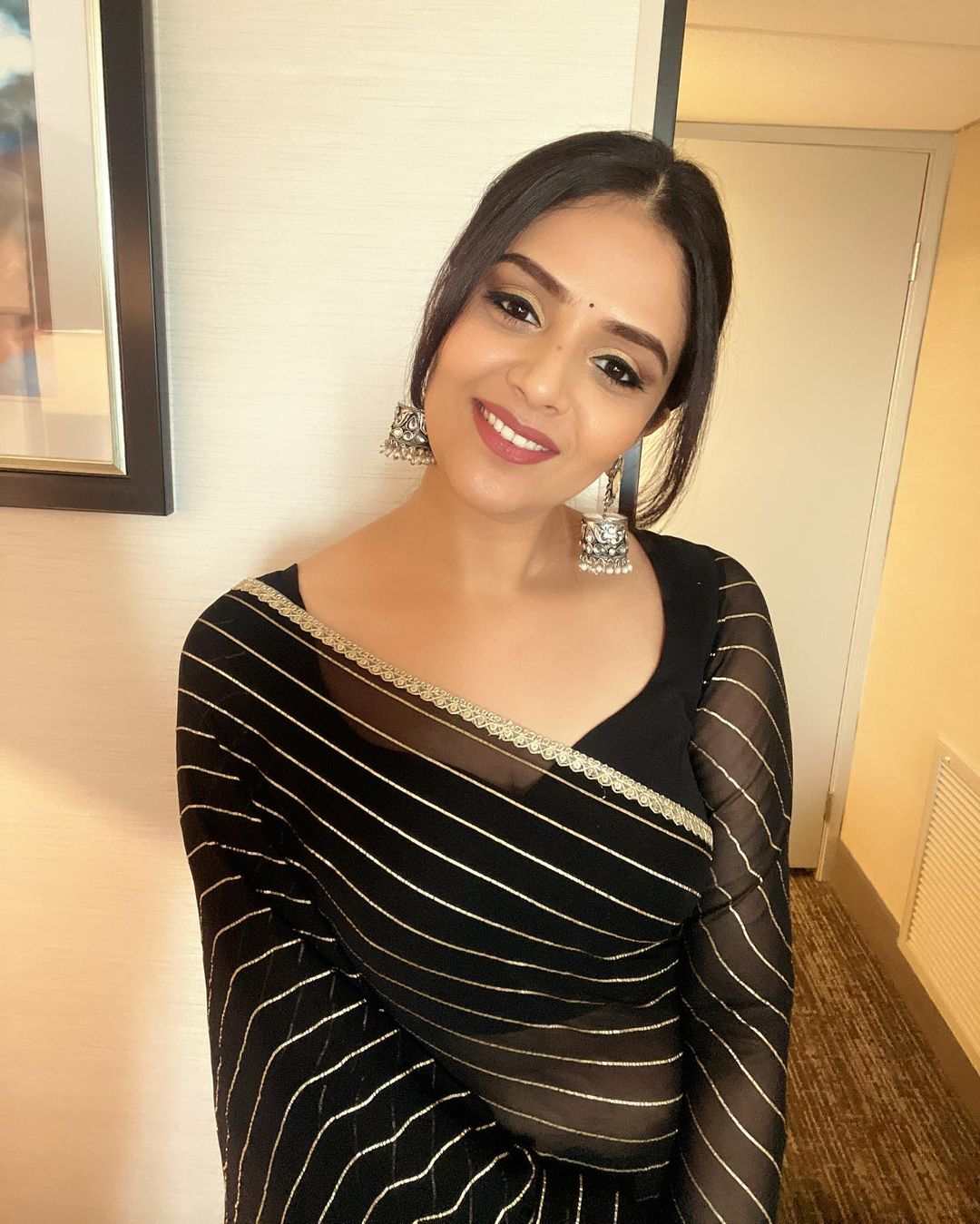 Actress Sreemukhi sure does know how to leave us wanting for more. The beauty has been a constant when it comes to giving fashion goals that are attainable for any of us. Recently for a show in Chicago that she had to host, she wore a black chiffon saree from Cindrella’s closet and we can’t keep calm.