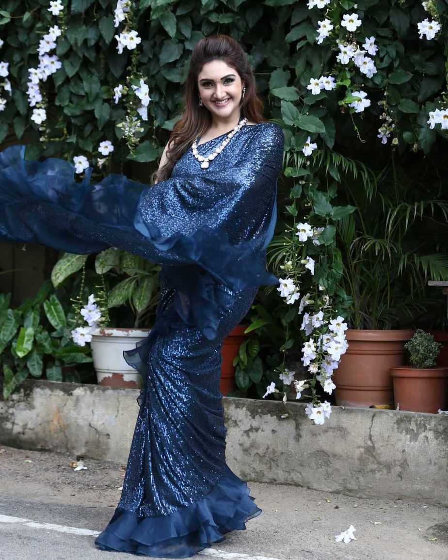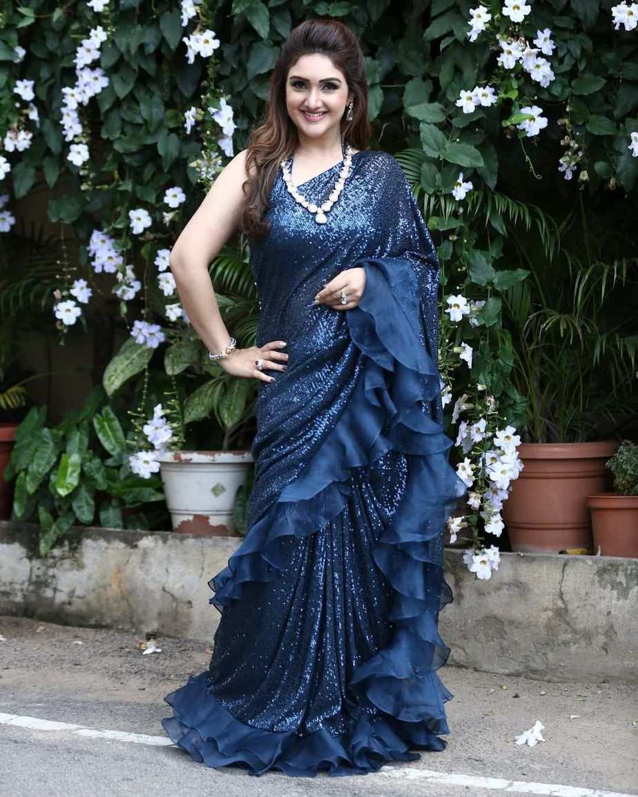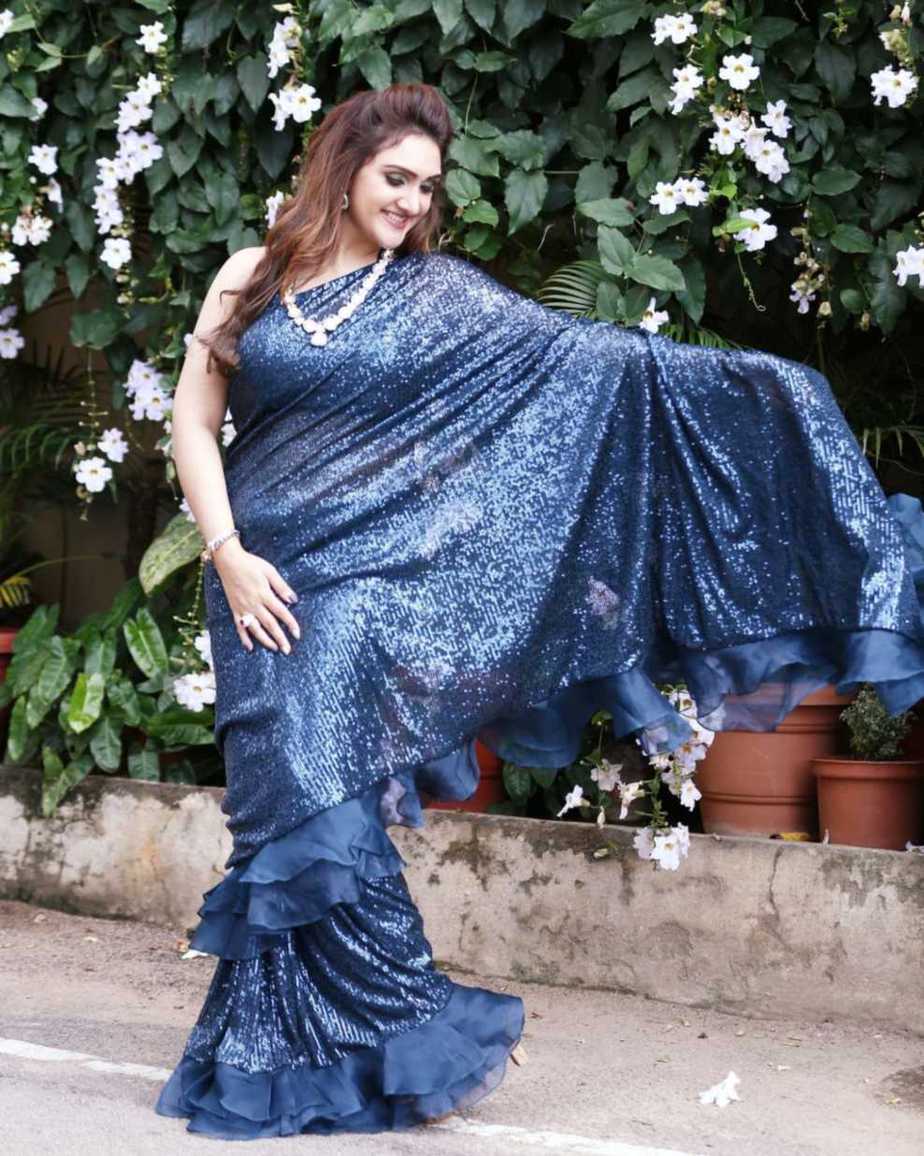 Sequinned sarees have a lot of celebrity fans and rightly so! Their huge popularity has transcended borders and none who lays an eye on them can resist them. The latest one to be spotted wearing a sequinned saree is actress Sridevi Vijaykumar. The beauty opted for the midnight blue hue saree from Neeru’s India for “Comedy Stars!”