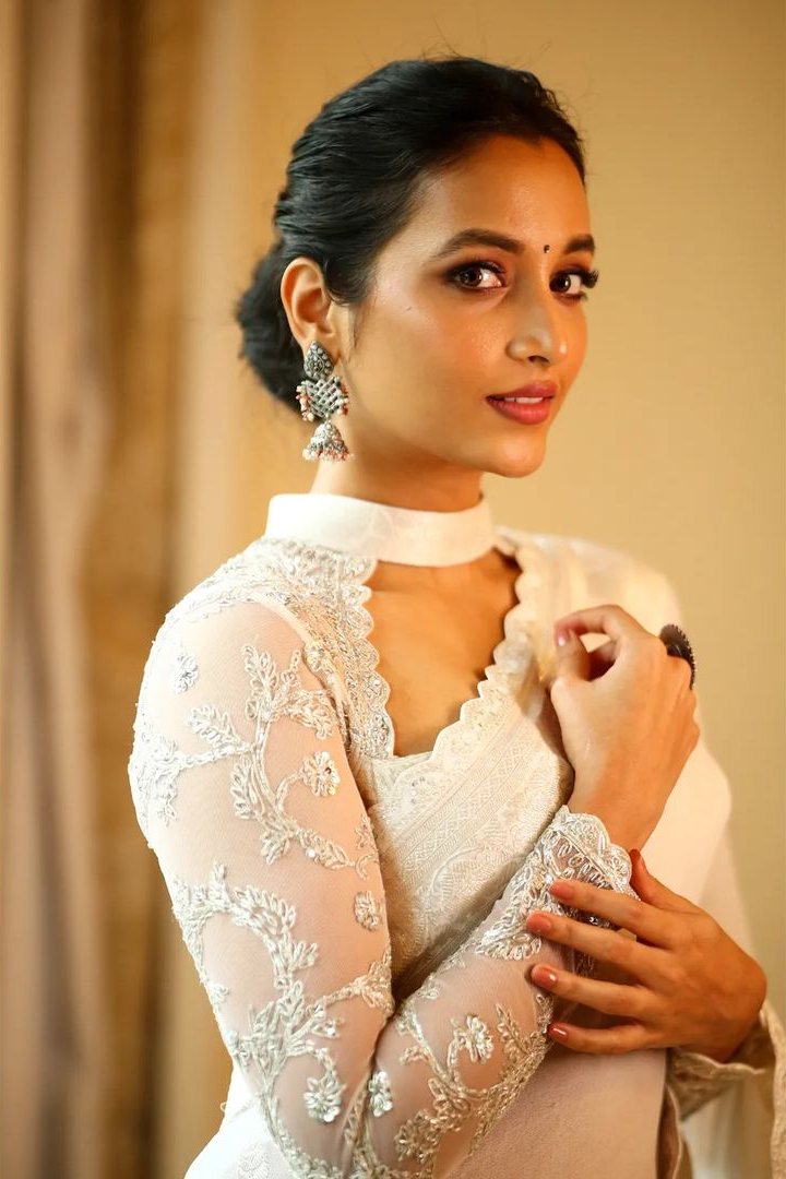 srinidhi shetty in ivory saree by kavitha gutta for cobra aduio launch1.2She accessorized the look with a pair of ruby studded earrings and a ring by Abhilasha Pret Jewellery. A low-tied bun with kohl-rimmed eyes, a bindi, blushed cheeks and nude lips.