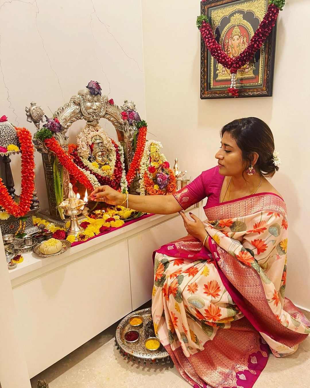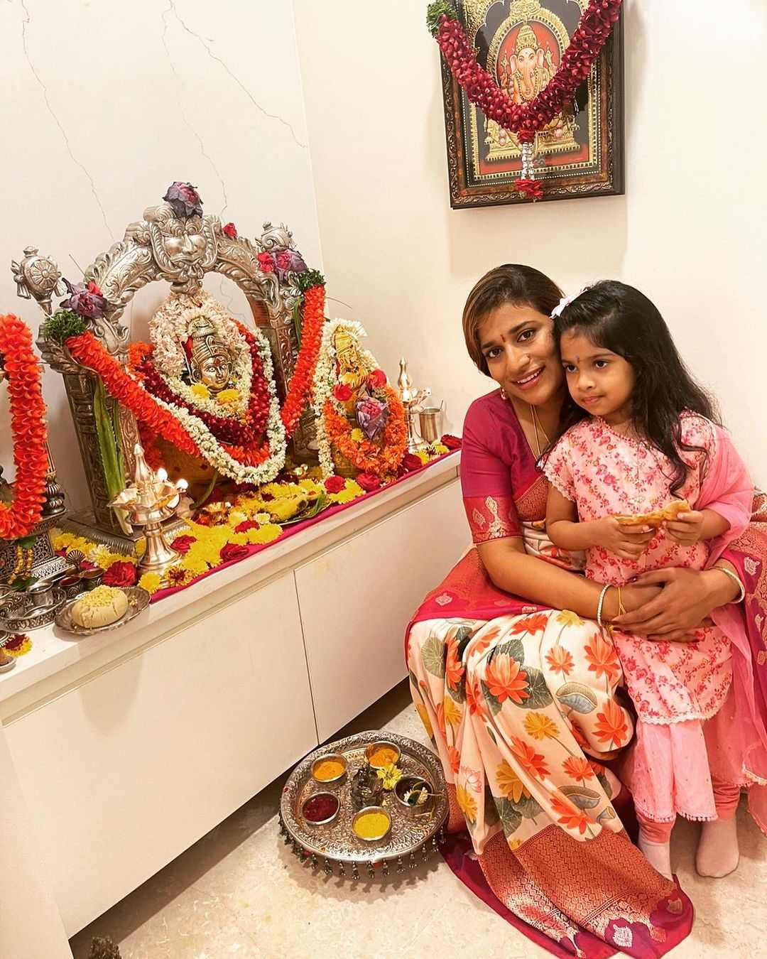Chiranjeevi’s daughter and producer Sushmita Konidela celebrated Varalakshmi Vratham in the presence of her family. Joined by her sister Sreeja Konidela and nieces Navishka and Nirvrithi, Sushmita was seen wearing an ivory floral silk saree for the puja.