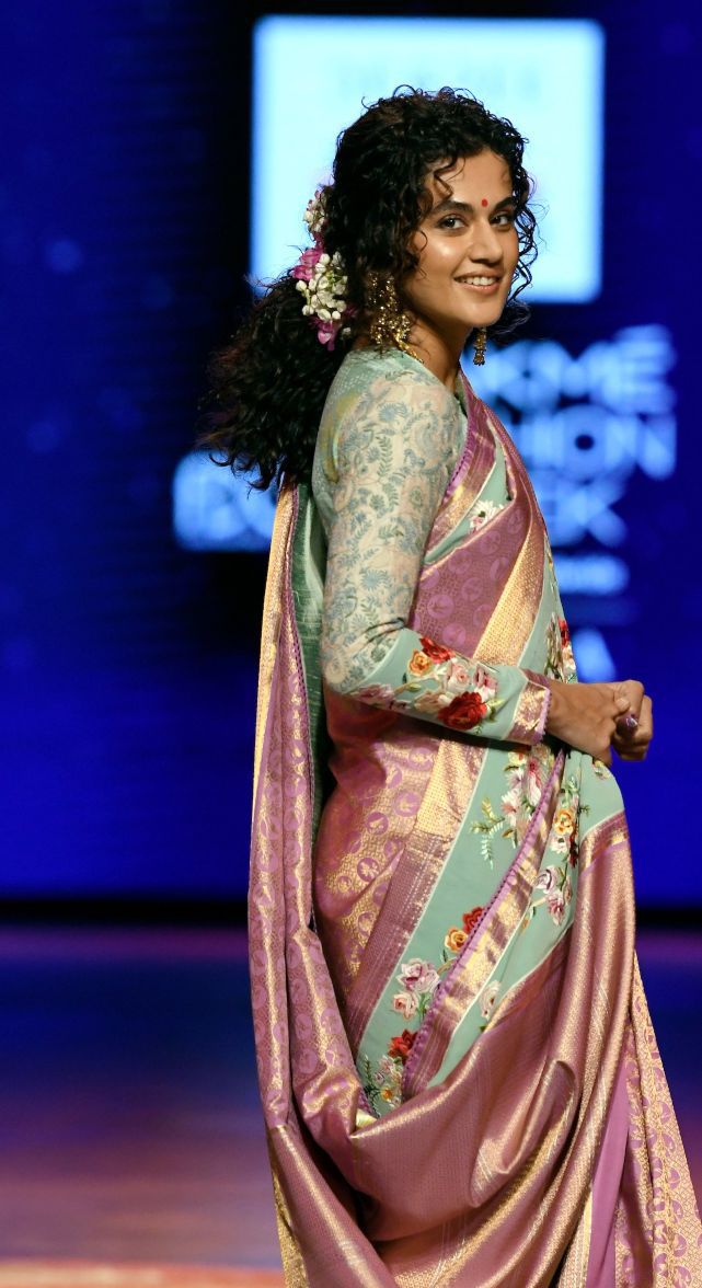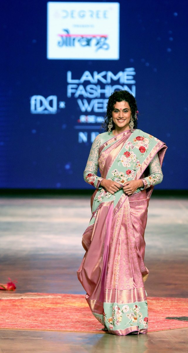 Tapsee Pannu in a pink pattu saree by Gaurang at LFW'21