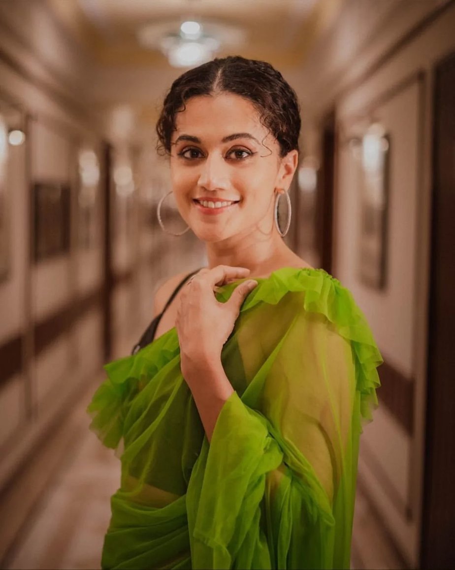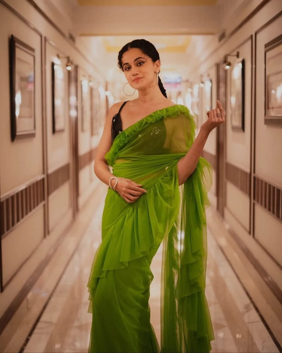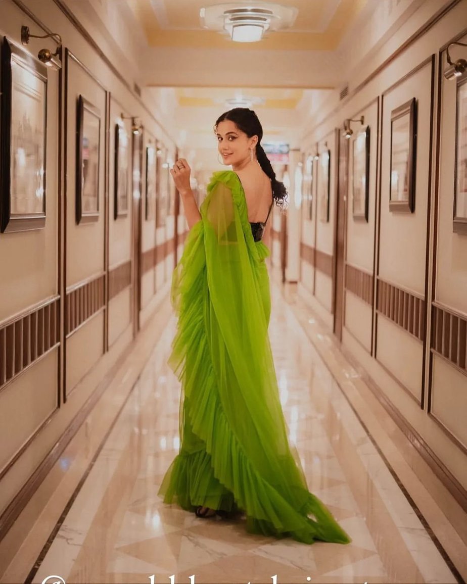 Actress Taapsee Pannu and Anurag Kashyap’s, “Dobaara” is been getting some rave reviews from the critics and audience. Taapsee is thrilled about the fact that the audience appreciated her role in a time traveller flick previously only explored in Hollywood. For the success meet of the movie, Taapsee was seen in a neon green pre-draped saree by Sourabhkant Srivastava.