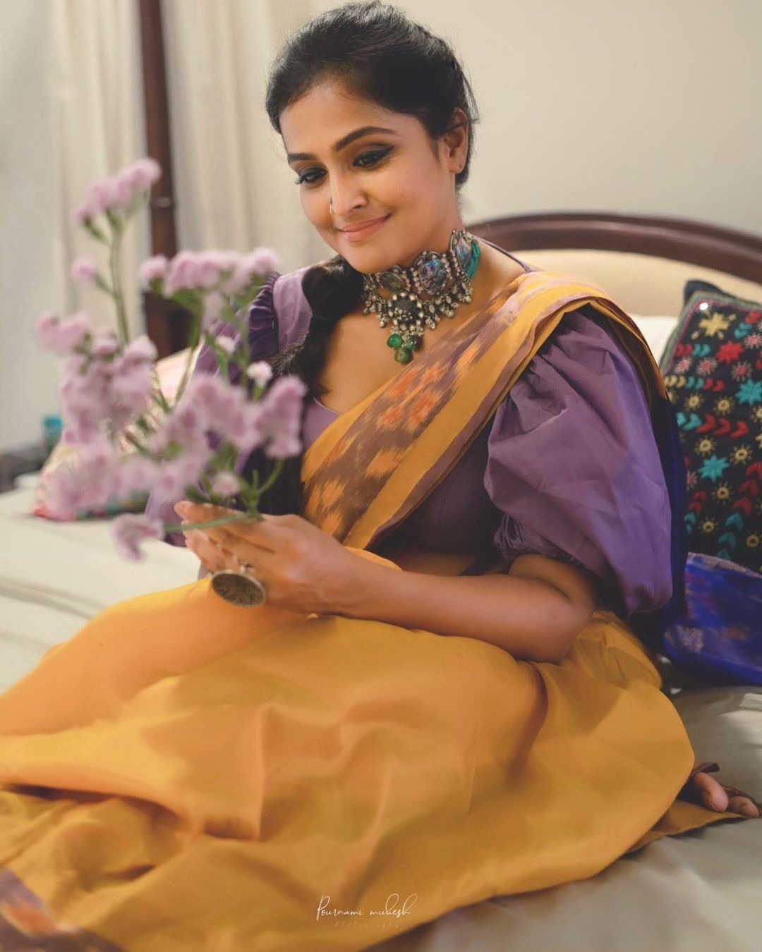 The traditional saree is handwoven with floral motifs on its hemline in lilac and shaded with orange. However, its body is sans prints or embellishments. The silk blouse, on the other hand, captures hearts with its bishop sleeves and cinched cuffs. Similar to the body of the saree, the round-necked blouse is plain.