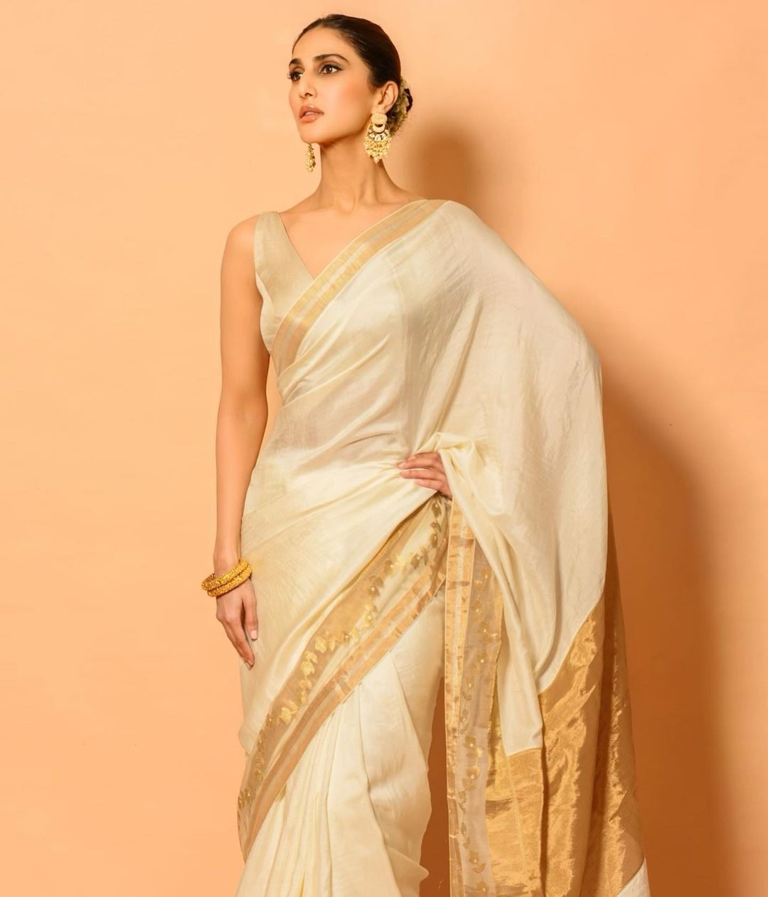 Actress Vaani Kapoor has created a lot of buzz with her role as a transgender woman in “Chandigarh Kare Aashiqui”. The movie was applauded for the way it handle such a sensitive subject. For her performance in the movie, Vaani was awarded the best actress award by Ficci Achievers’ Awards’22! She attended the event in an ivory saree by Raw Mango.