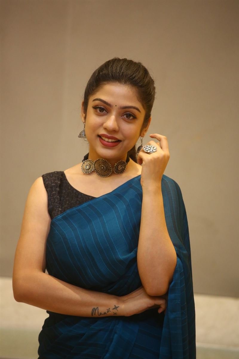 With its unique story and comic set-up, the movie, “Swathy Muthyam” is winning hearts at the theatres. It is also equally loved by the critics for making a serious topic so entertaining. Last day the cast gathered to celebrate the success of the movie and actress Varsha Bollamma resorted to a blue saree for the event.